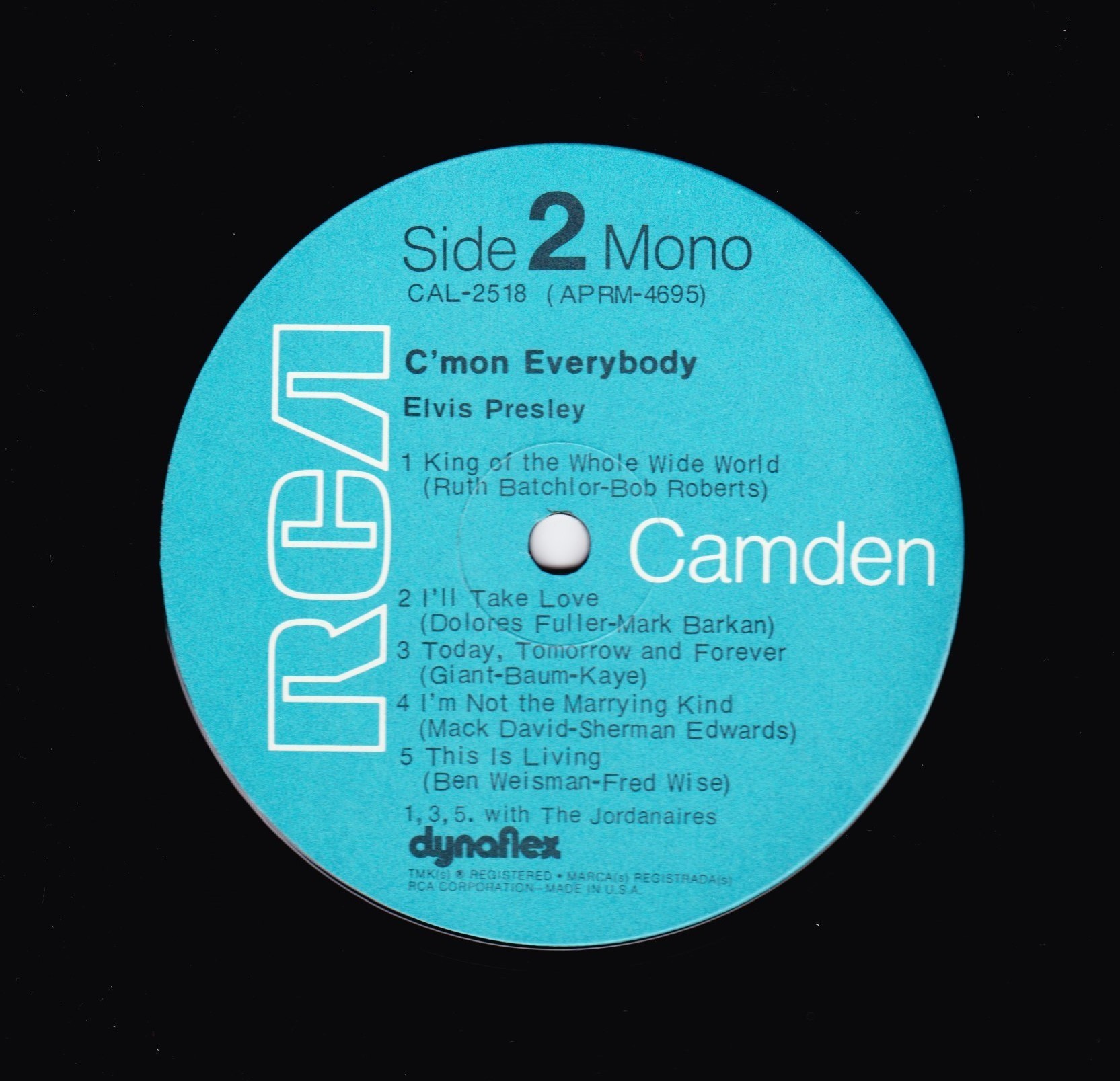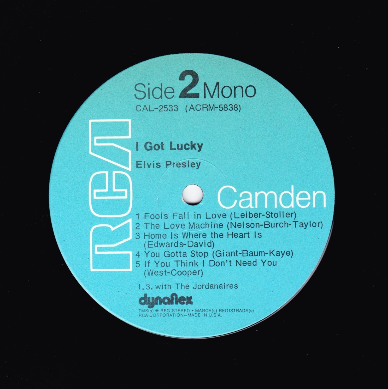 number top left. Camden top left. *NOTE* Rear cover number "2" bottom right. Copyright – RCA Records This is for an RCA Records Indianapolis pressing of the CAL-2533 catalog number. This release has the blue RCA Camden labels and a cover code "2" printed on the back bottom right corner of the cover. The first catalog number appears on the spine, front and back covers and labels. The second catalog number appears on the bottom left corner of the back cover. This release is very similar in label and cover composition (aside from the lack of a printed cover code) to Elvis Presley - I Got Lucky. Matrix / Runout (Side A label): ACRM-5837 |