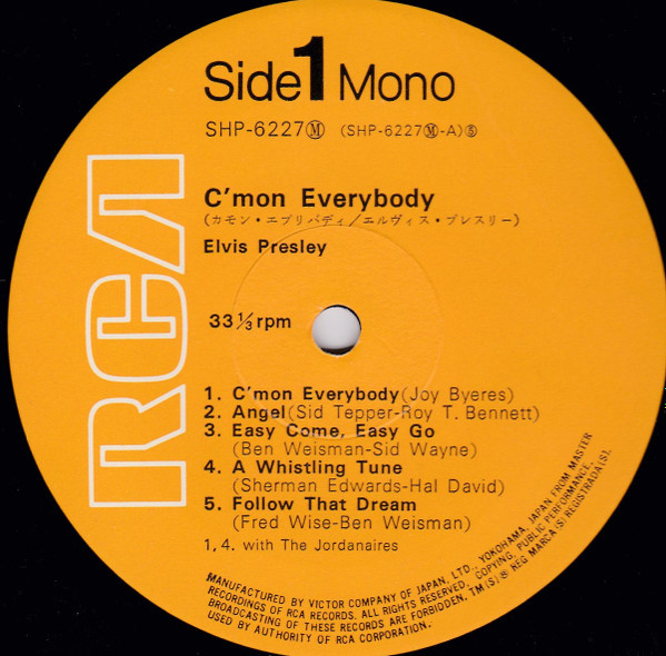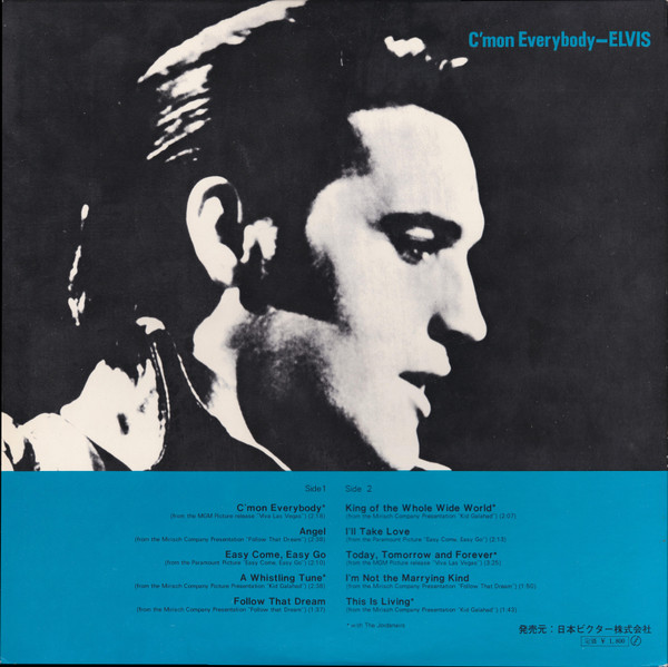 EVERYBODY (LP) Brief History : C'mon Everybody is a compilation album by Elvis Presley. The album was released in July 1971. All tracks from this album originated from four of Elvis's films and were only released on soundtrack EP's prior to this issue. The remaining EP tracks from the same four movies were compiled into another album, "I Got Lucky", released three months later. It was certified Gold on 1/6/2004 by the RIAA. Front Cover : Photo of Elvis. Title top right. Catalogue