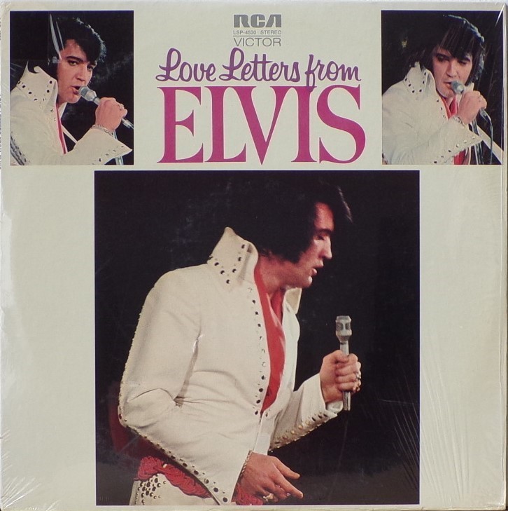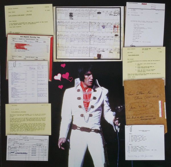 RCA Studio B, Nashville, June 4, 1970 Brief History : Love Letters from Elvis is a 1971 studio album by Elvis Presley. The album was made up of leftovers from Elvis' marathon June 1970 recording sessions in Nashville. Most of the other 35 songs recorded during those sessions had been used in Elvis' 1970 albums That's the Way It Is and Elvis Country (I'm 10,000 Years Old). Wanting to squeeze out a third album from the sessions, RCA records had producer Felton Jarvis mix, overdub and compile the remaining songs. However, few of the songs had the rock, country, or gospel feel that inspired Elvis to his greatest performances. As a result the album was critically panned upon release, and failed to crack the top 20 of the Billboard album charts. The song's title track was a rare instance of Presley re-recording a past hit in the studio, his original version of "Love Letters" having been released as a single in 1966. "Got My Mojo Working" is edited down from an impromptu jam session; Presley's version incorporates lyrics from "Hands Off", a 1955 song by Frankie Castro released on the Wing record label (RCA often mislabelled this song "Keep Your Hands Off of It" when the complete jam was issued on CD years later). Three songs from this album were released on singles. The single "Life / Only Believe" was released in March 1971 and reached only #53 on the US Billboard Singles chart. It was Elvis's lowest chart position for a single since "Almost in Love" had reached #95 in late 1968. "Heart Of Rome" was placed on the B-side of the non-album track "I'm Leavin'" released as a single in August 1971. Front Cover : 3 Photos of Elvis. Title top centre. Catalogue