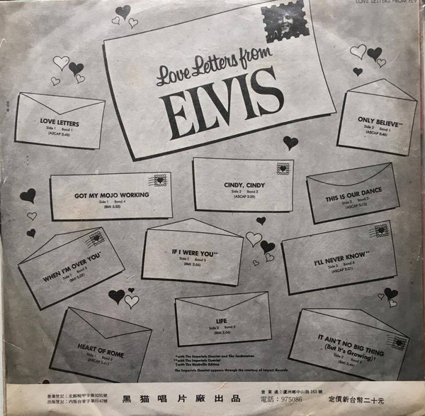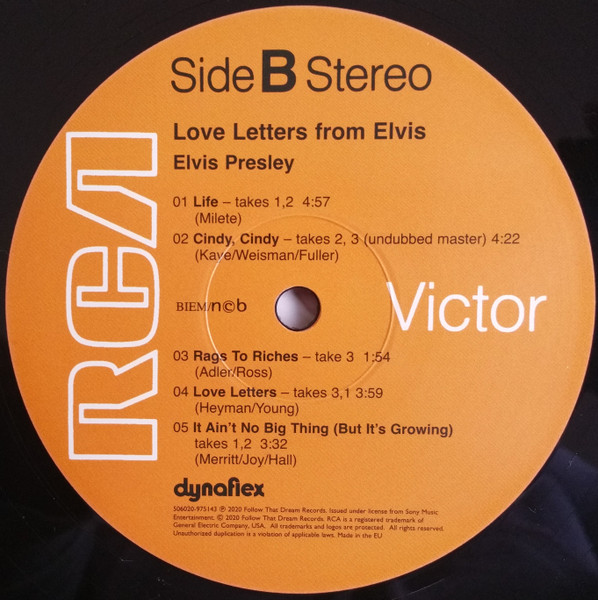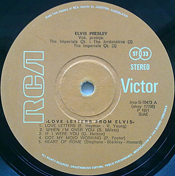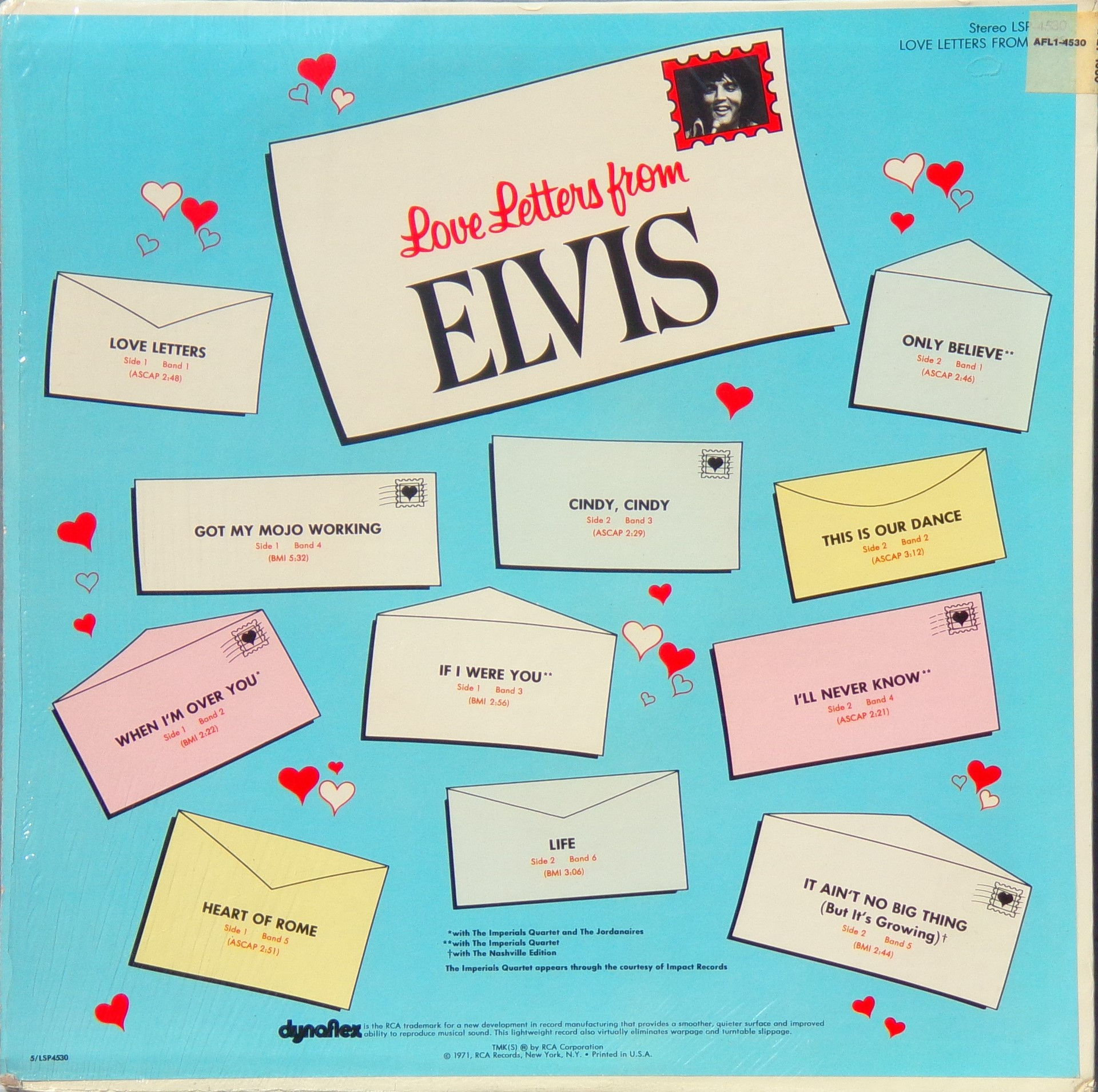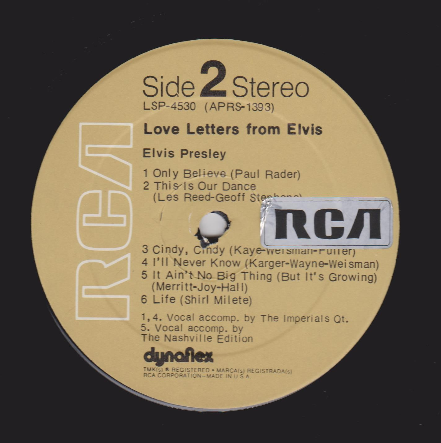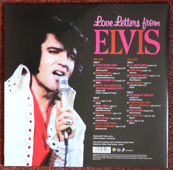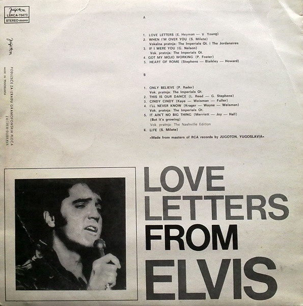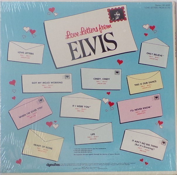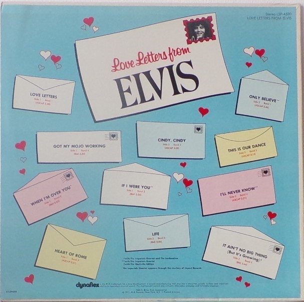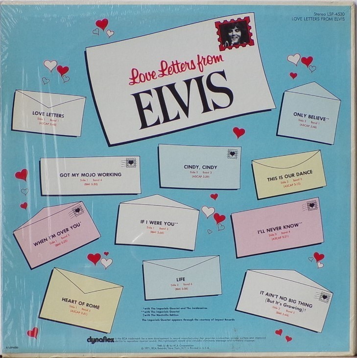 LETTERS FROM ELVIS (LP) (US) RCA LSP 4530 Released: June 1971 Side 1 Love Letters (1970) **** When I'm Over You **** If I Were You ***** Got My Mojo Working - Keep Your Hands Off Of It ** Heart Of Rome *** Side 2 Only Believe This Is Our Dance *** Cindy, Cindy * I'll Never Know *** It Ain't No Big Thing (But It's Growing) *** Life * Recorded:
