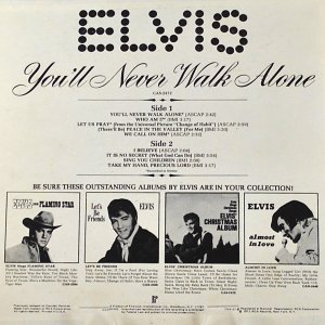 February 22, 1969 Brief History : You'll Never Walk Alone is a gospel compilation album by Elvis Presley, released in 1971 on RCA Camden. The album consisted primarily of previously released Gospel recordings by Presley dating back as far as 1957. The single You'll Never Walk Alone was a minor hit for him in the late 1960s. Two previously unissued recordings are included: "Let Us Pray" from the soundtrack of Presley's 1969 film, Change of Habit and "Who Am I?", a leftover from the early-1969 recording sessions that produced his album From Elvis in Memphis. It was certified Gold on 3/27/1992, Platinum on 7/15/1999 and 3x Platinum on 1/6/2004 by the RIAA. Front Cover : Photo of Elvis. Name "Elvis"