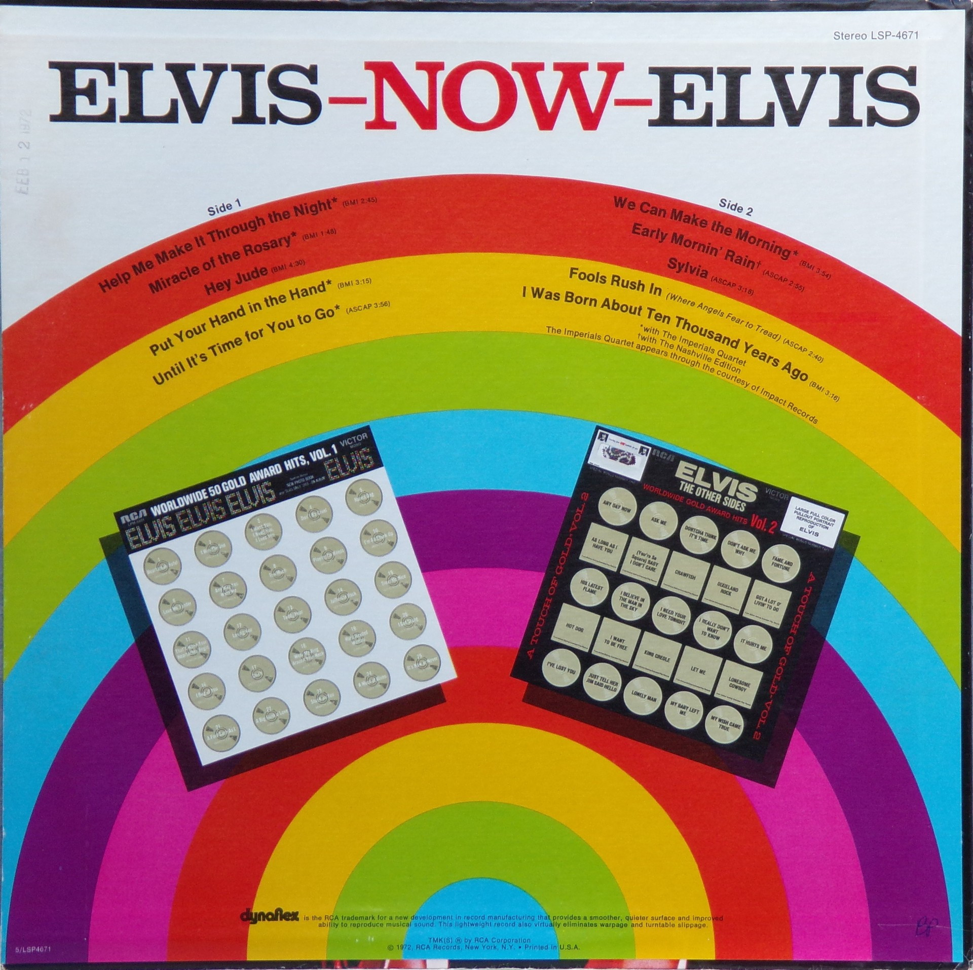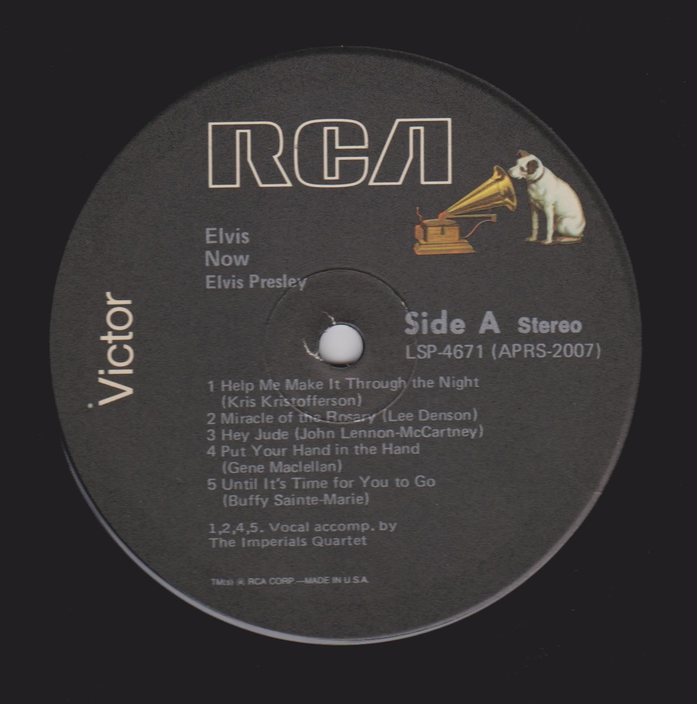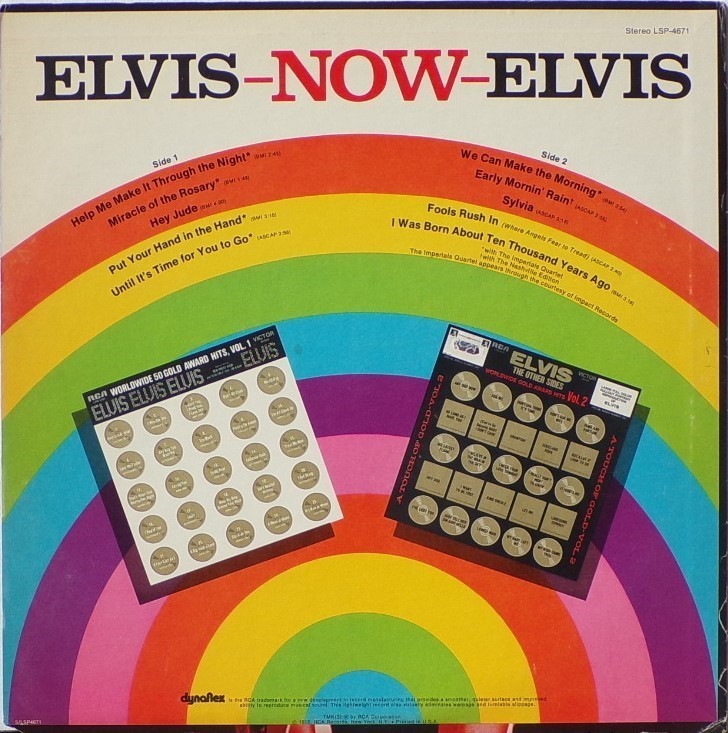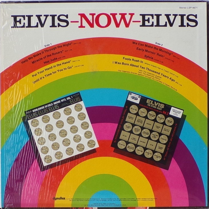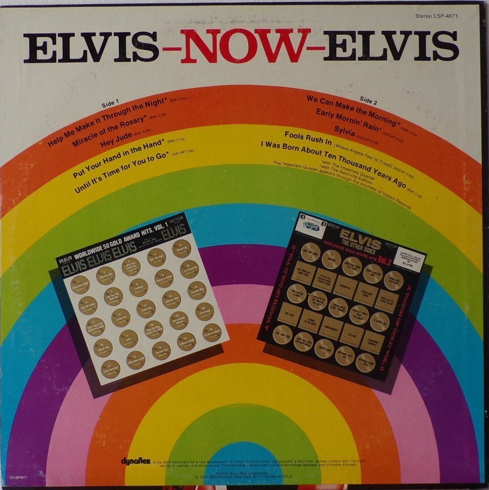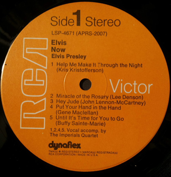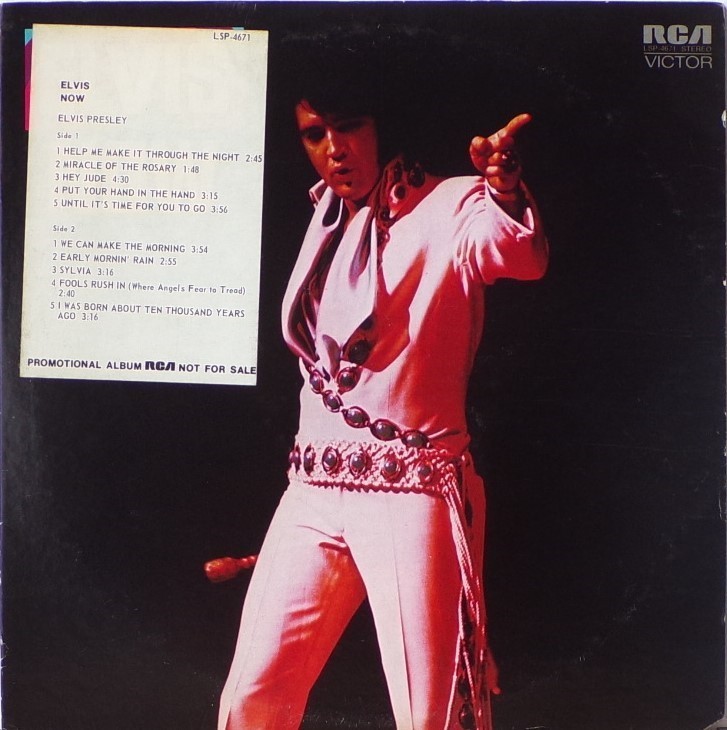 NOW (LP) (US) RCA LSP 4671 Released: February 1972 Side 1 Help Me Make It Through The Night ****** Miracle Of The Rosary ***** Hey Jude * Put Your Hand In The Hand ********* Until It's Time For You To Go ****** Side 2 We Can Make The Morning ******** Early Mornin' Rain **** Sylvia *** Fools Rush In (Where Angels Fear To Tread) ******* I Was Born About Ten Thousand Years Ago ** * Recorded: American Studios, Memphis,