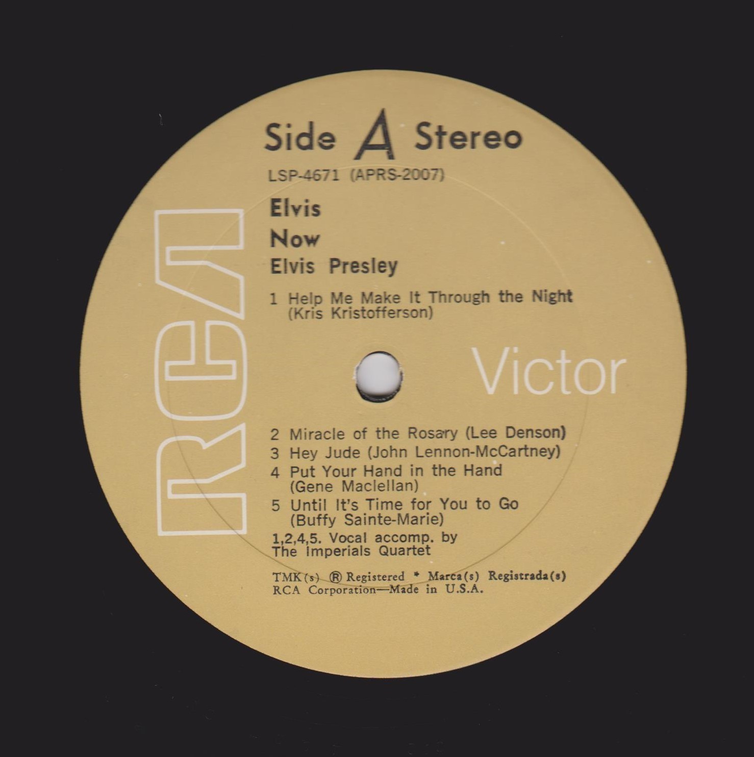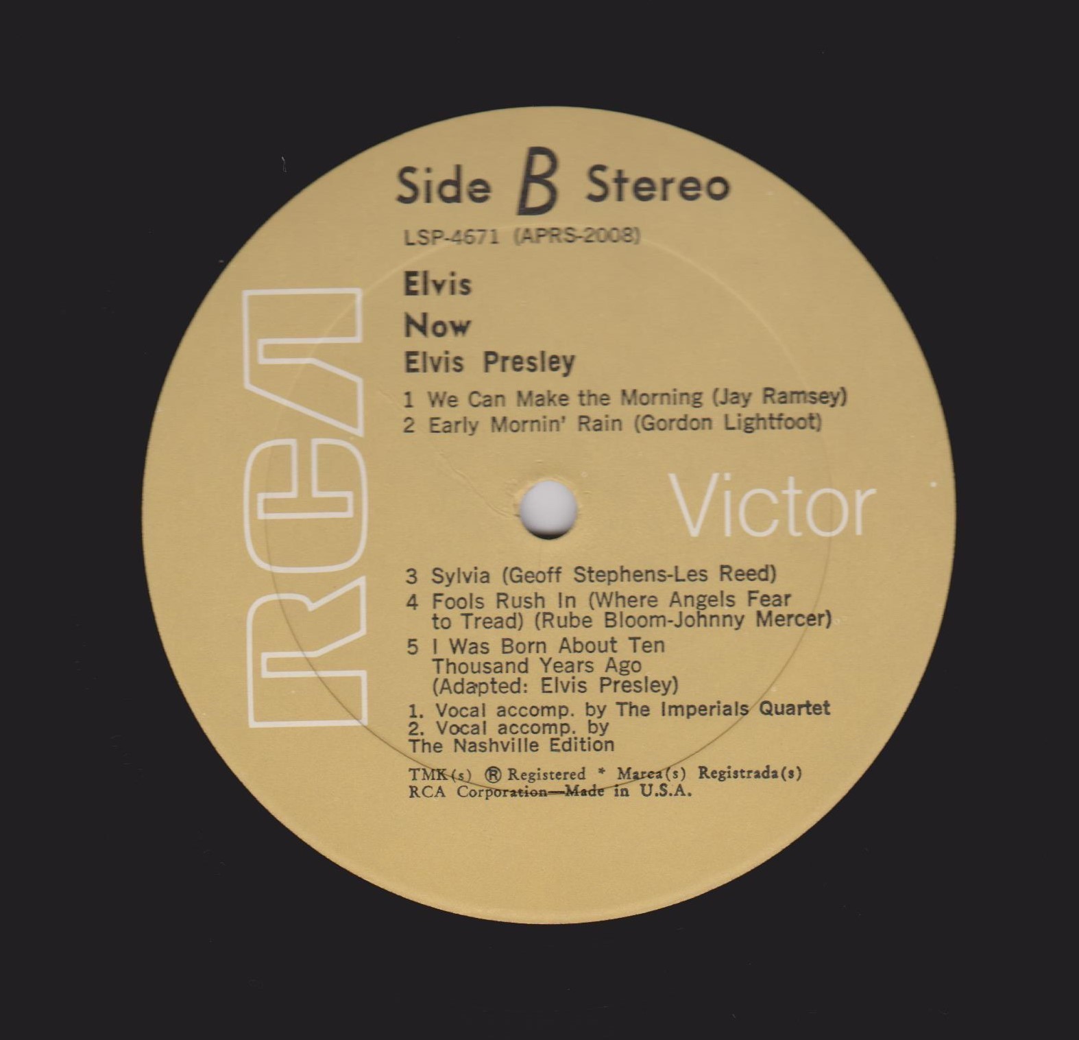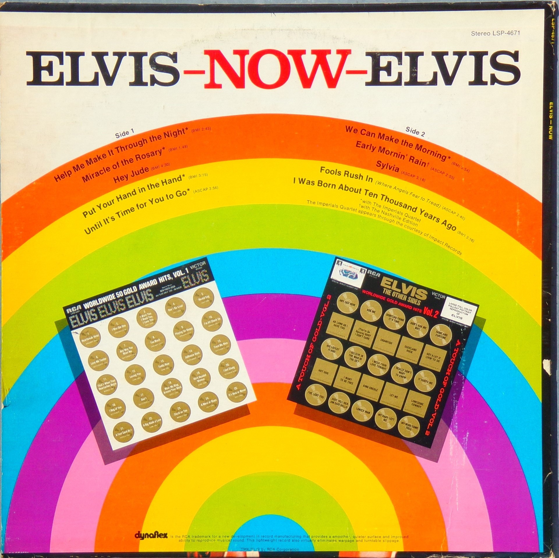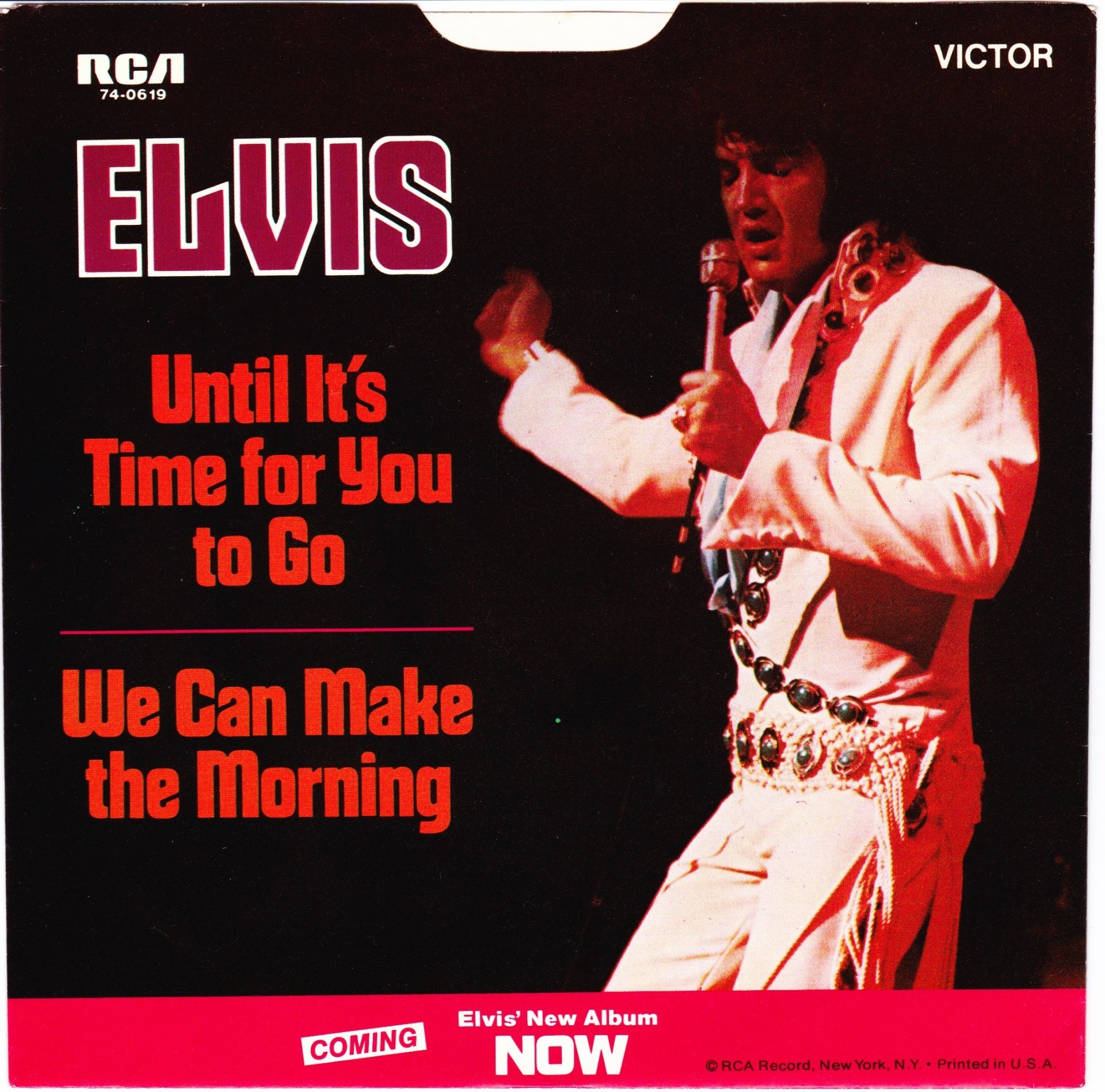 NOW (LP) (US) RCA LSP 4671 Released: February 1972 Side 1 Help Me Make It Through The Night ****** Miracle Of The Rosary ***** Hey Jude * Put Your Hand In The Hand ********* Until It's Time For You To Go ****** Side 2 We Can Make The Morning ******** Early Mornin' Rain **** Sylvia *** Fools Rush In (Where Angels Fear To Tread) ******* I Was Born About Ten Thousand Years Ago ** * Recorded: American Studios, Memphis,