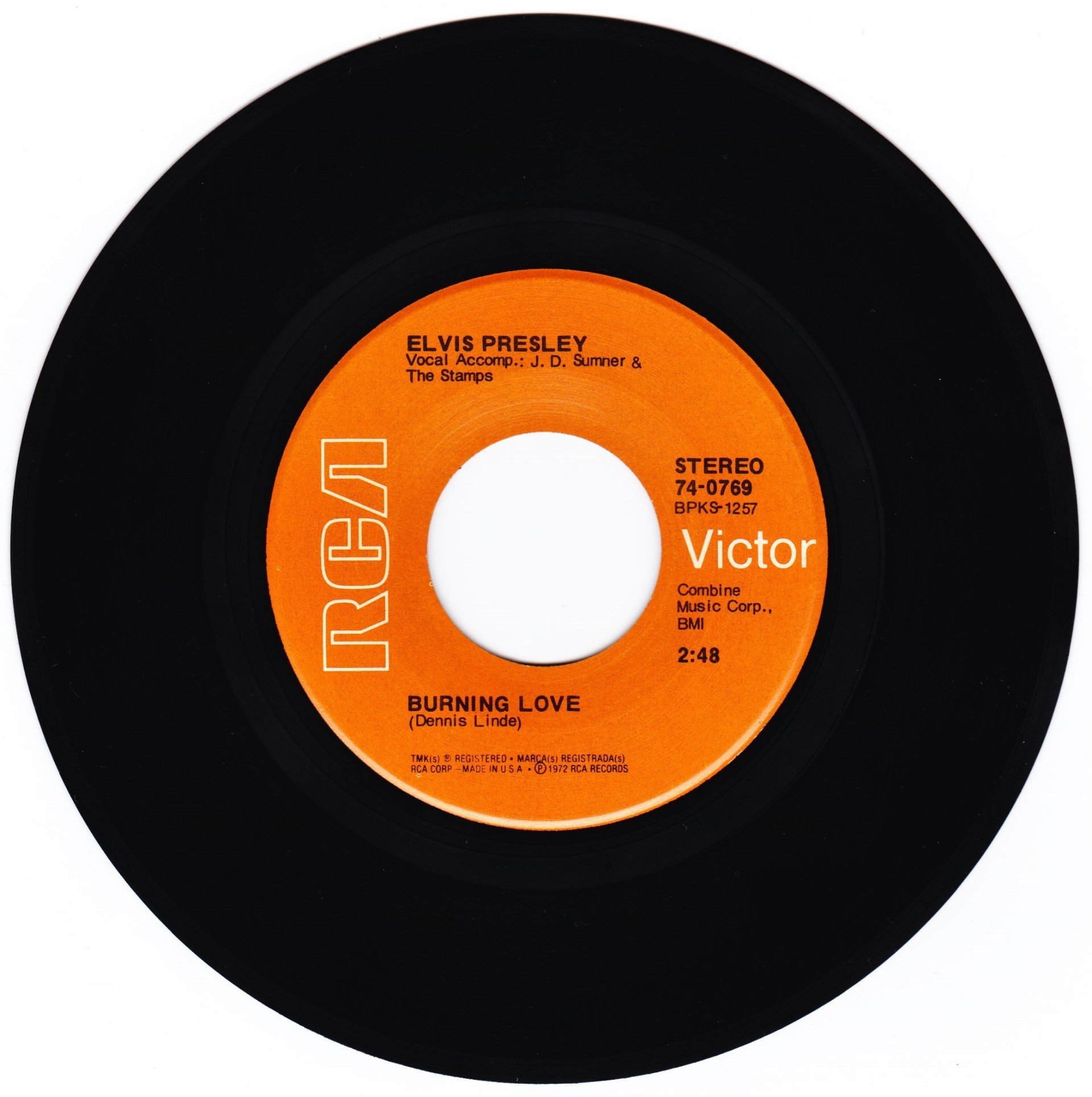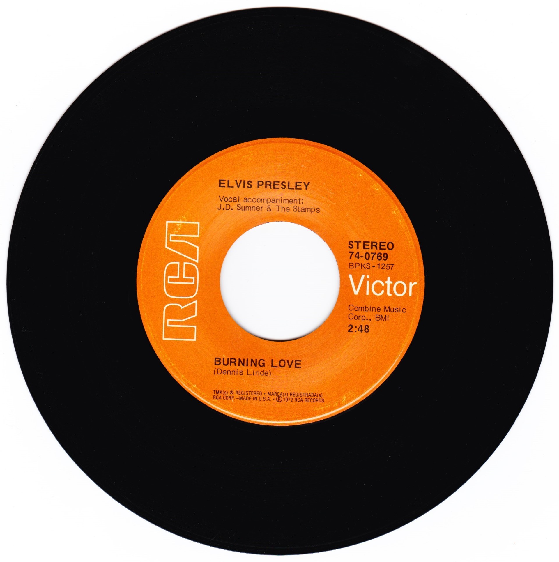 | Front Cover : Picture Sleeve Rear Cover : Picture Sleeve Label : Orange Pressing Plant : Rockaway (Hand Etched) Matrix Number Side 1 : BP - KM 1257 - 5S A1E (Hand Etched) Matrix Number Side 2 : BP - KM 1260 - 6S A1H (Hand Etched) *NOTE* Front cover has no split at top. Font is light print. BMI on Burning Love side on 2 lines. |