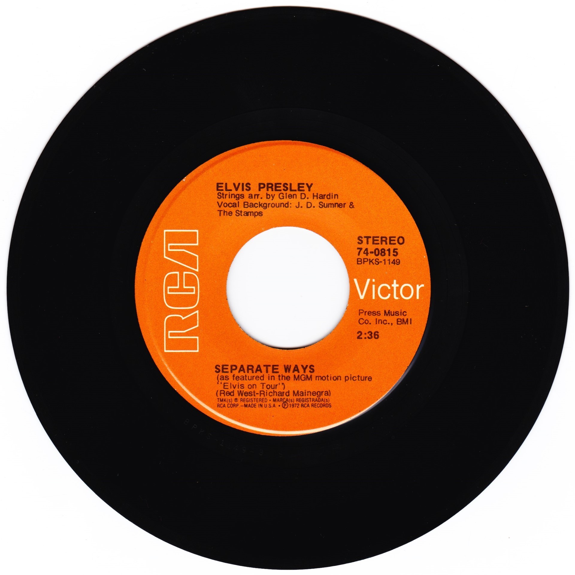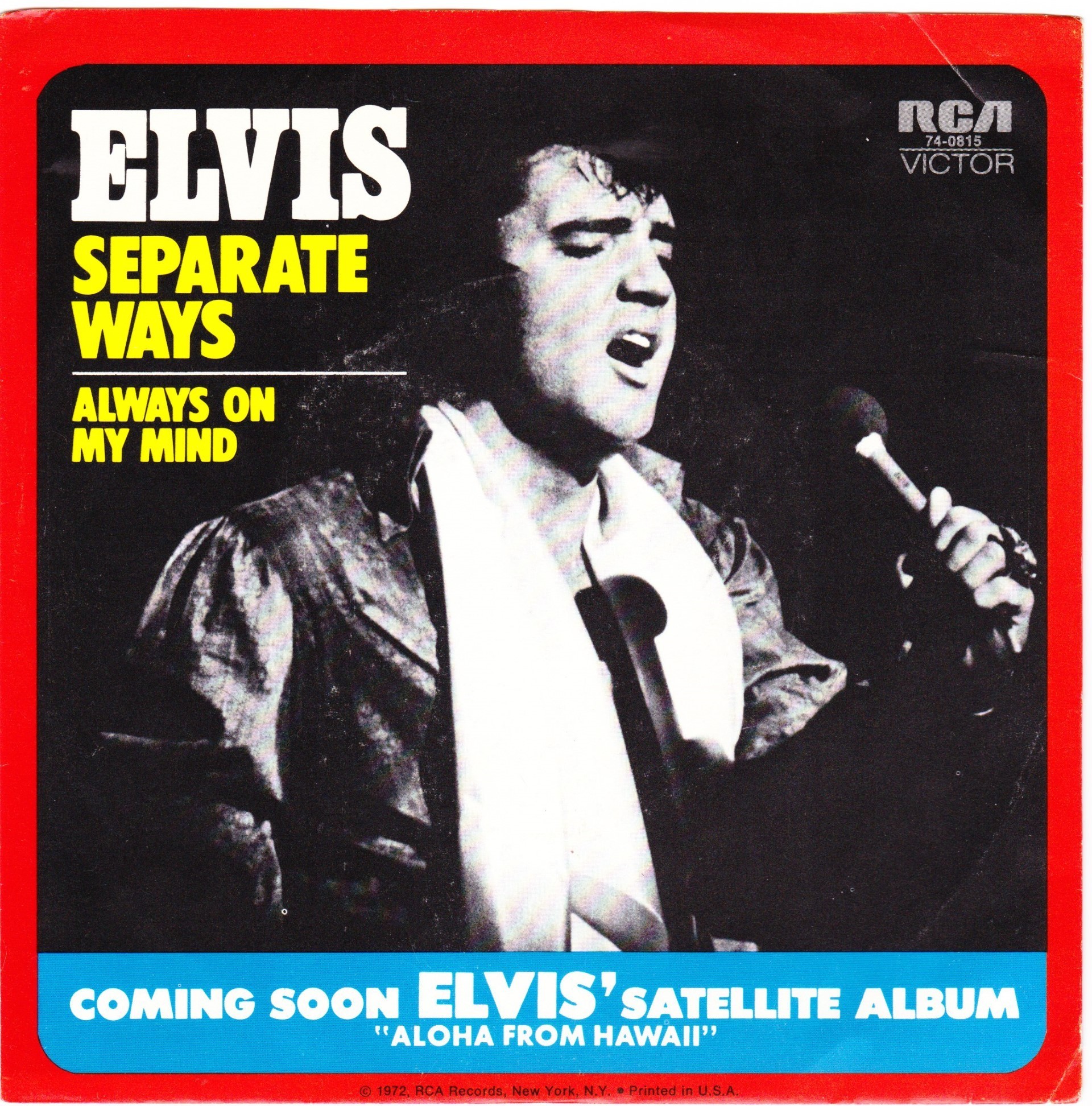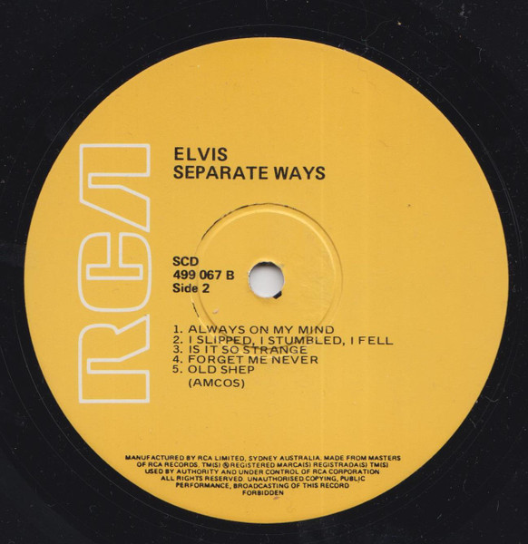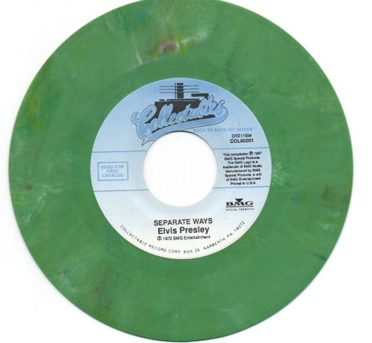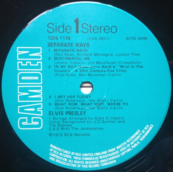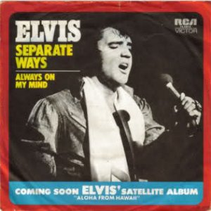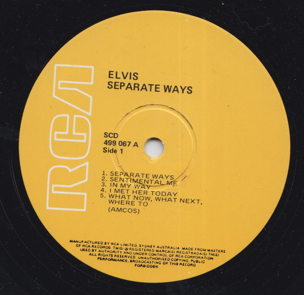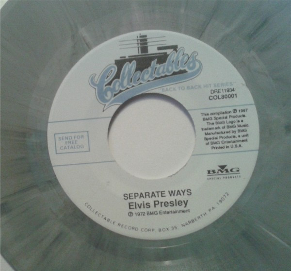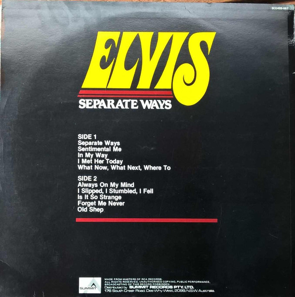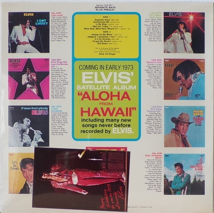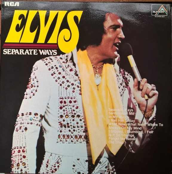 WAYS (LP) Brief History : Separate Ways is a compilation album by Elvis Presley from 1972. Released by RCA Records under its RCA-Camden subsidiary exactly one month after another compilation, Burning Love and Hits from His Movies, Volume 2, Separate Ways was the second and final attempt by RCA to repackage older Elvis recordings by pairing them with a recent hit single, in this case "Separate Ways" and its flipside "Always On My Mind". The remainder of the album -- which was not promoted as a compilation on the front cover -- consisted of a mixture of previously released recordings from Presley film soundtracks of the 1960s, plus one song, "Old Shep", dating back to 1956. The album was reissued by Pickwick/Camden utilizing the original catalogue number CAS-2611. The only apparent difference is the cover indicates Pickwick at the bottom center front, where as the original issue indicated RCA. The contents of the re-issue are exactly the same as the original issue. It just missed the top 10 of the Billboard charts on its release and has since gone on to sell over 3 million copies world-wide. It was certified Gold on 3/27/1992 and Platinum on 1/6/2004 by the RIAA. Front Cover : Photo of Elvis. Title top right. Catalogue