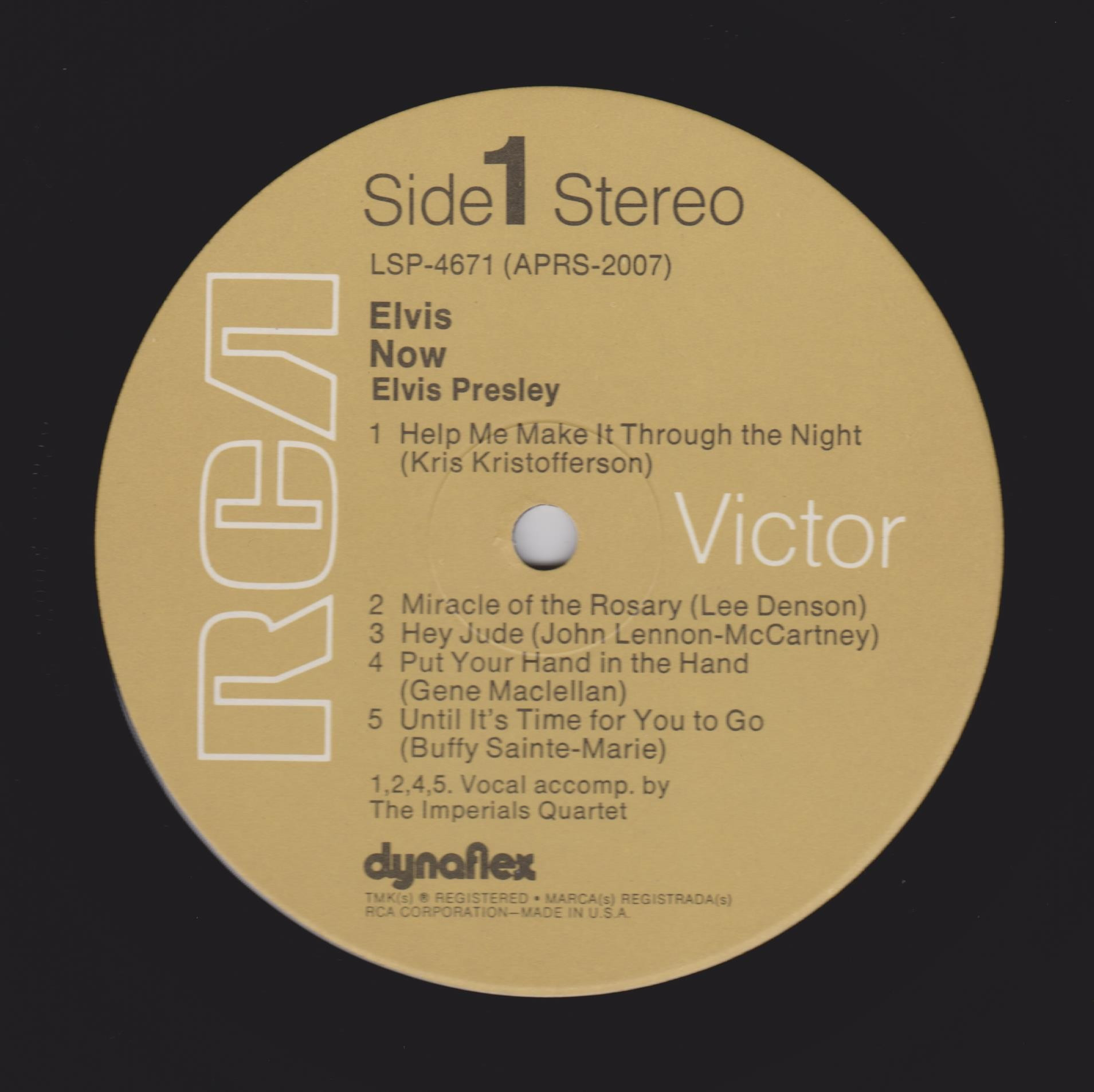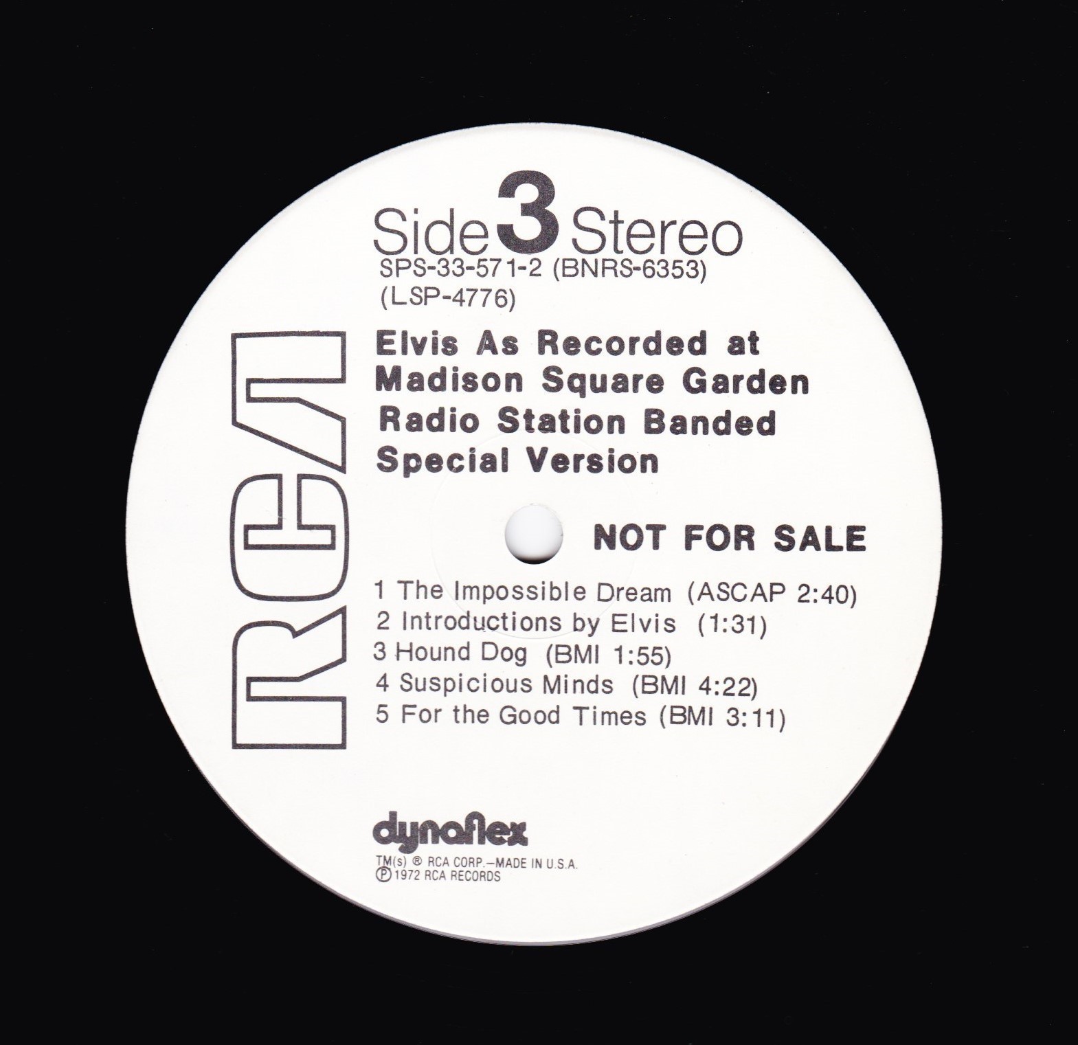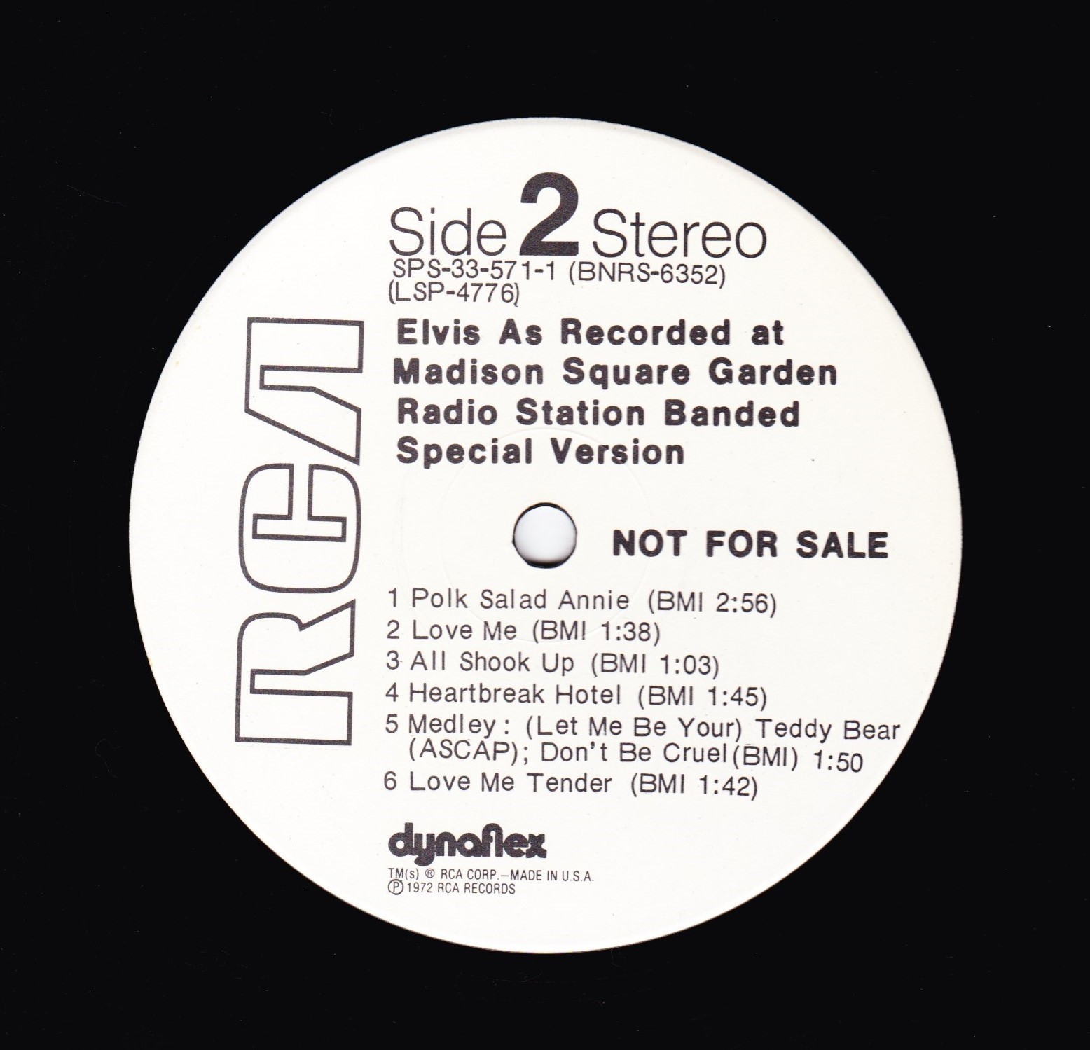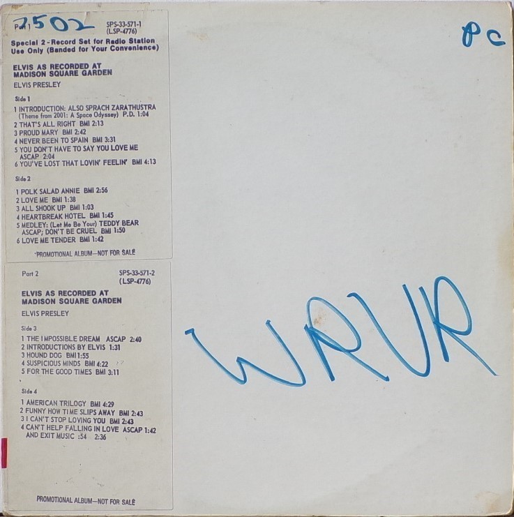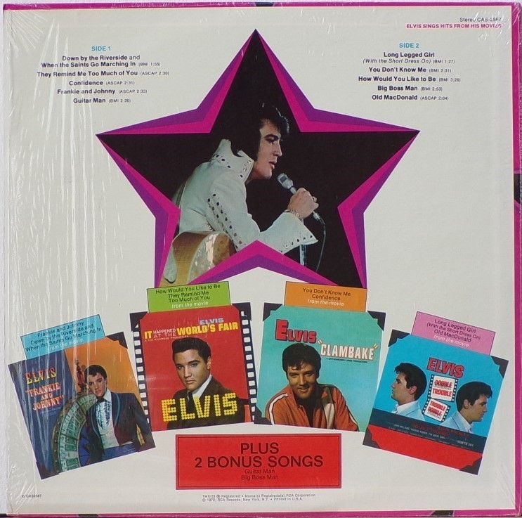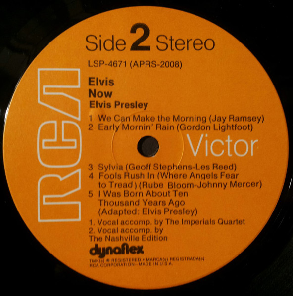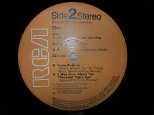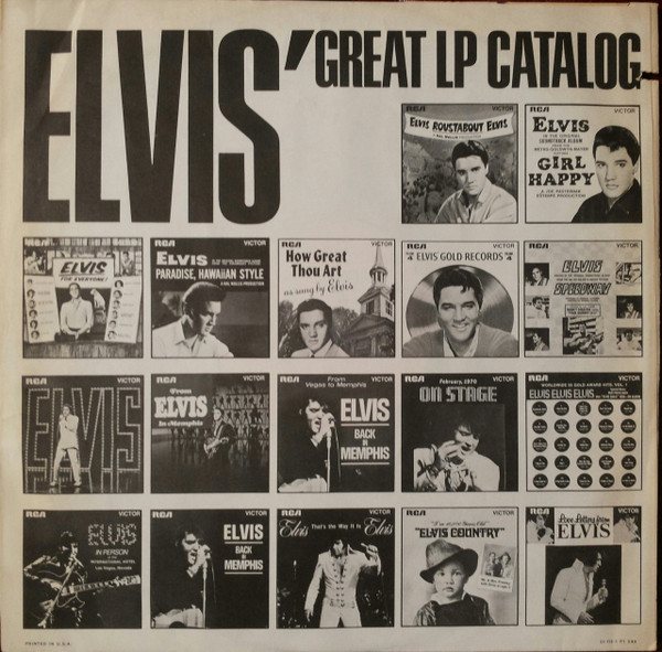 | ront Cover : Title on top. Catalogue number top right. Rear Cover : Advertising 2 Elvis Worldwide box sets. Catalogue number top right. Printed in U.S.A. bottom centre. Label : Orange. Dynaflex vinyl. Side 1 : Stereo at top. Side 2 : Stereo at top. Pressing Plant : Indianapolis Matrix Number Side 1 : APRS - 2007 - 5S A3 (Machine Stamped) Matrix Number Side 2 : APRS - 2008 - 5S A2 (Machine Stamped) *NOTE* Front cover sticker Promotional copy for DJ use "Not For Sale". |