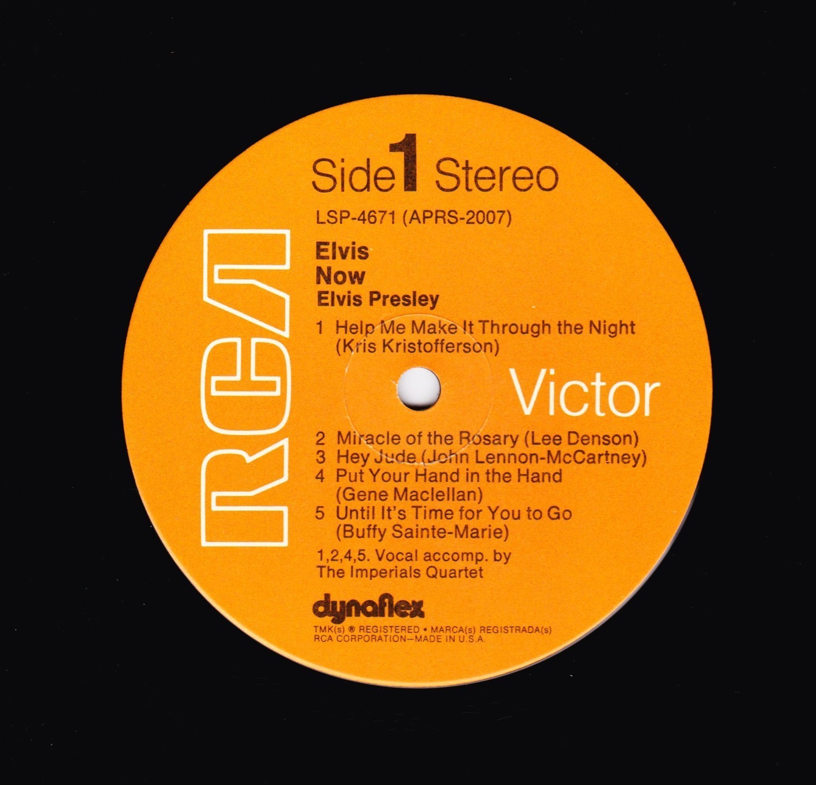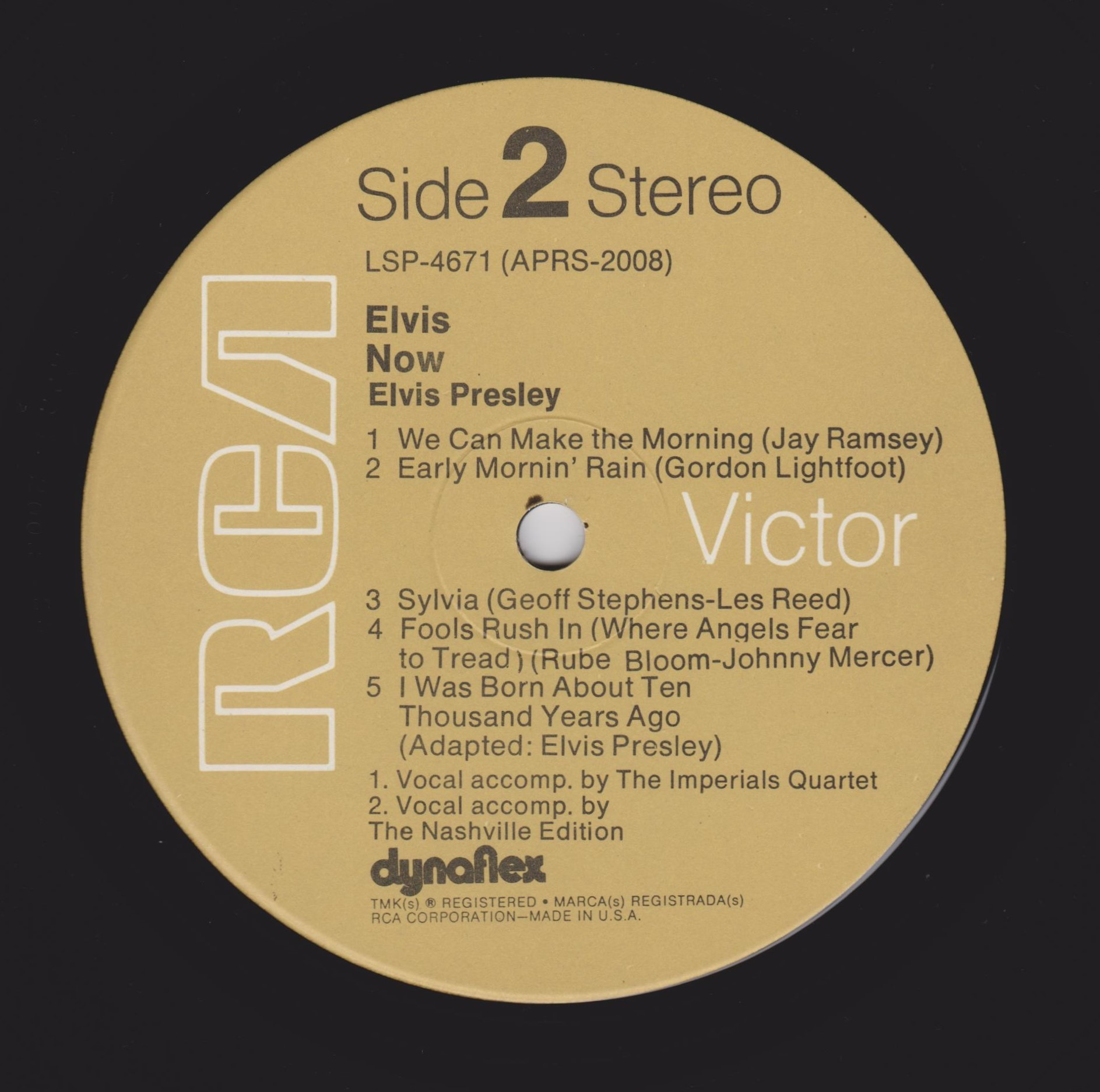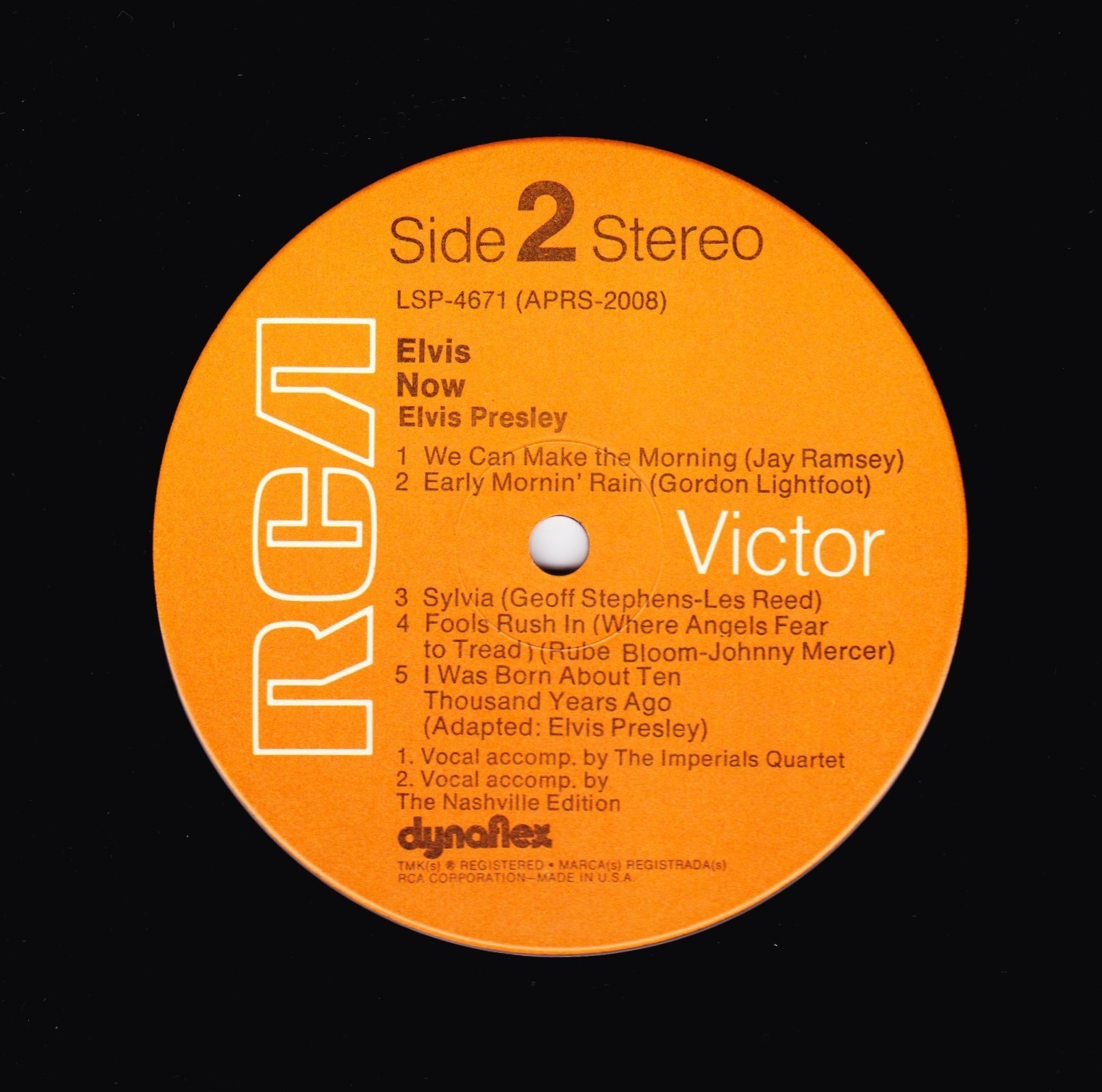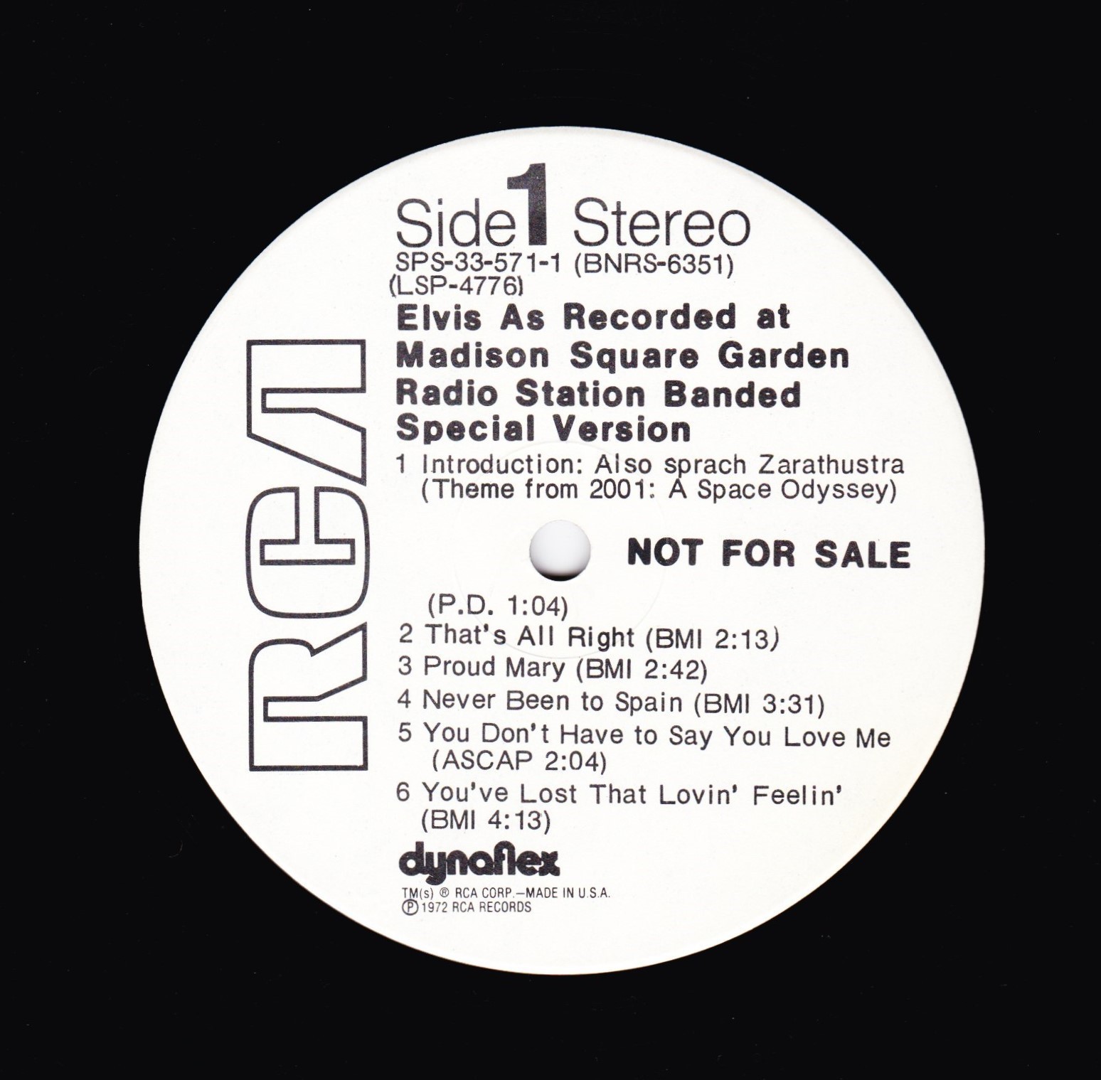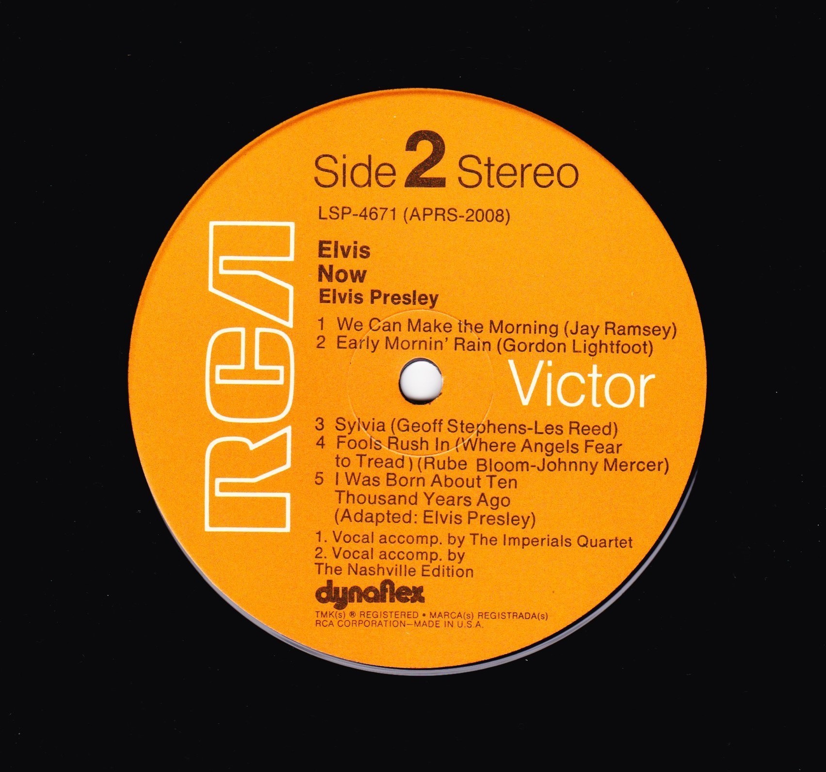 | ront Cover : Title on top. Catalogue number top right. Rear Cover : Advertising 2 Elvis Worldwide box sets. Catalogue number top right. Printed in U.S.A. bottom centre. Label : Orange. Dynaflex vinyl. Side 1 : Stereo at top. Side 2 : Stereo at top. Pressing Plant : Indianapolis Matrix Number Side 1 : APRS - 2007 - 5S A3 (Machine Stamped) Matrix Number Side 2 : APRS - 2008 - 5S A2 (Machine Stamped) *NOTE* Front cover sticker Promotional copy for DJ use "Not For Sale". |