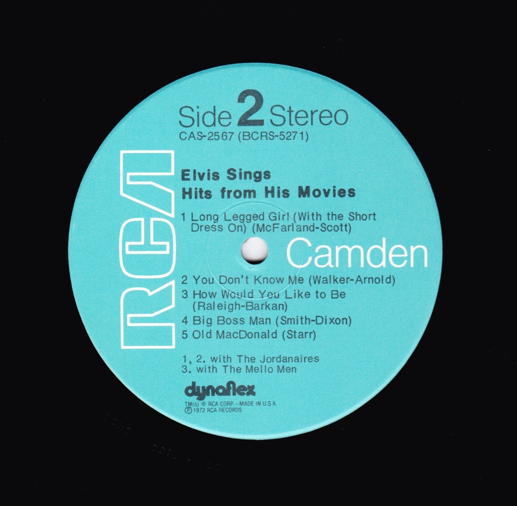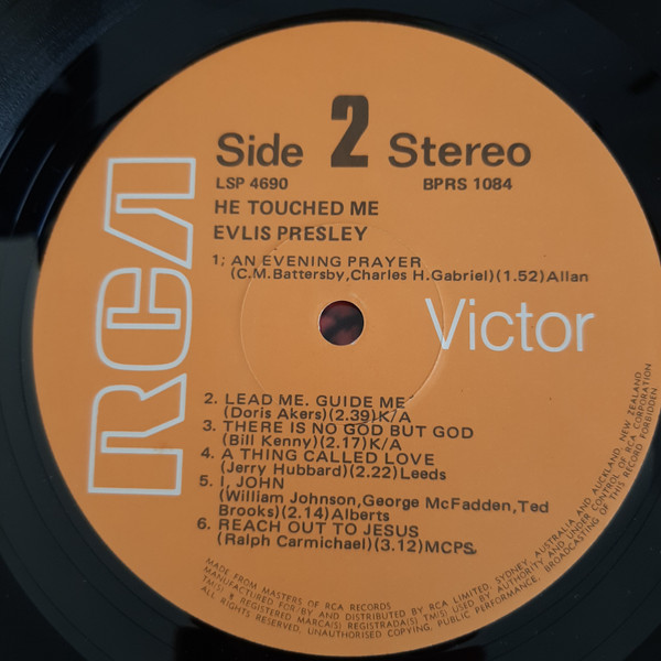 number top left. Rear Cover : Promoting 2 Elvis albums. Catalogue number top right. Printed in U.S.A. bottom. Label : Orange. Dynaflex vinyl. Side 1 : Stereo at top. Side 2 : Stereo at top. Pressing Plant : Rockaway (Hand Etched) Matrix Number Side 1 : BPRS - 5144 - 5S AID (Hand Etched) Matrix Number Side 2 : BPRS - 5145 - 5S BID (Machine Stamped) *NOTE* Rear cover number "2" bottom right. |