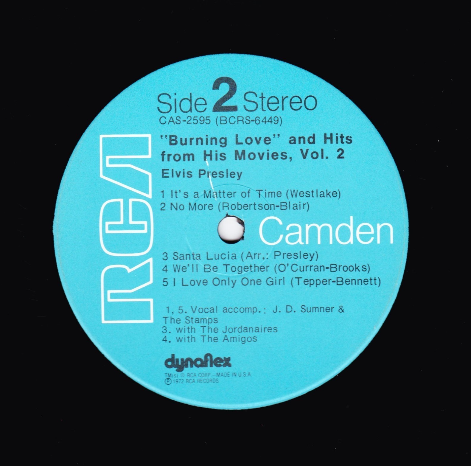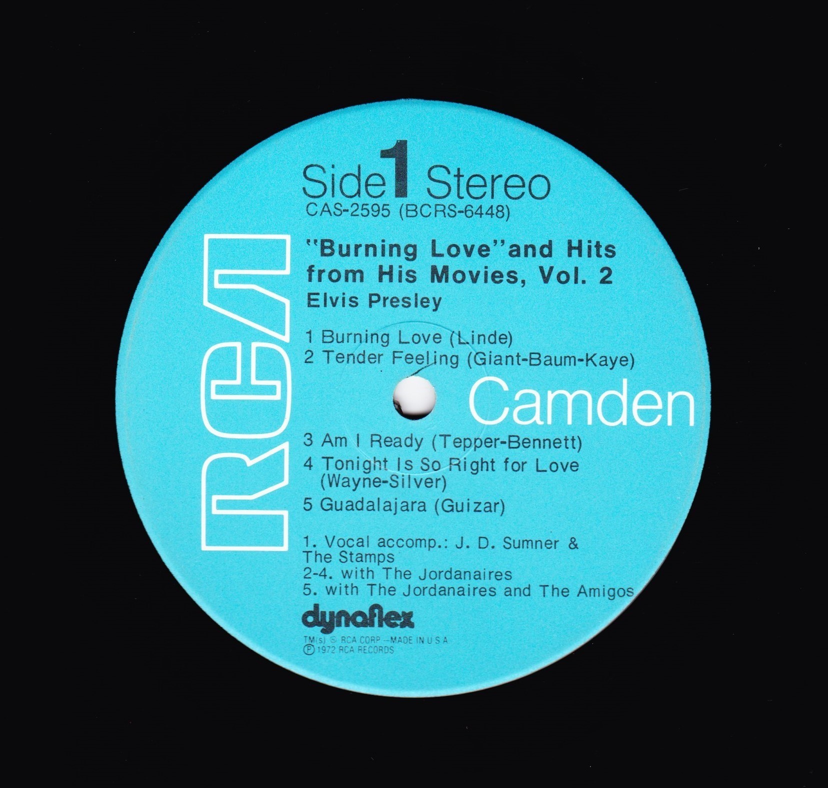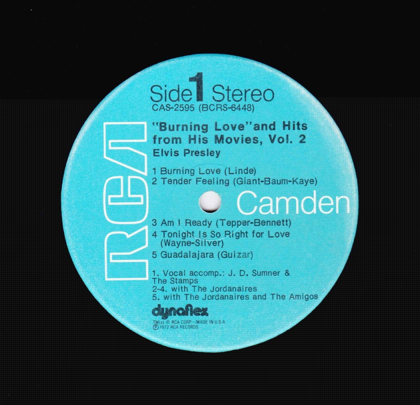number bottom right. Camden bottom right. Rear Cover : Advertising 8 Elvis budget albums. Catalogue number top right. Printed in U.S.A. bottom. Advert bottom right for coming soon album "Aloha From Hawaii". Label : Blue. Dynaflex vinyl. Side 1 : Stereo at top. Side 2 : Stereo at top. Pressing Plant : Rockaway (Hand Etched) Matrix Number Side 1 : BCRS - 6448 - 1S A2AP (Hand Etched) Matrix Number Side 2 : BCRS - 6449 - 1S AIBG (Hand Etched) *NOTE* Front cover has no yellow splash star highlighting the limited special bonus photo. This is one of 2 covers that came with this release. |