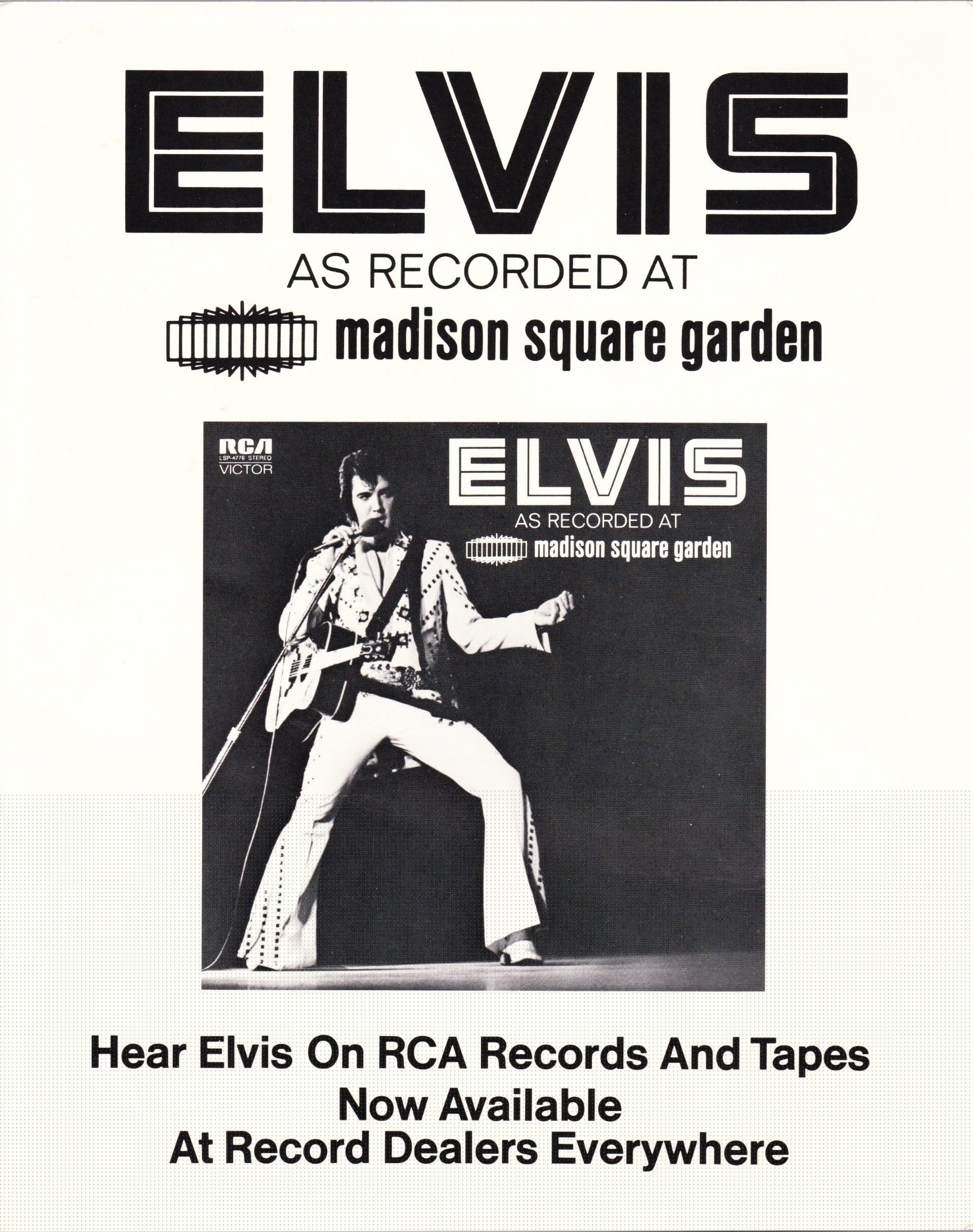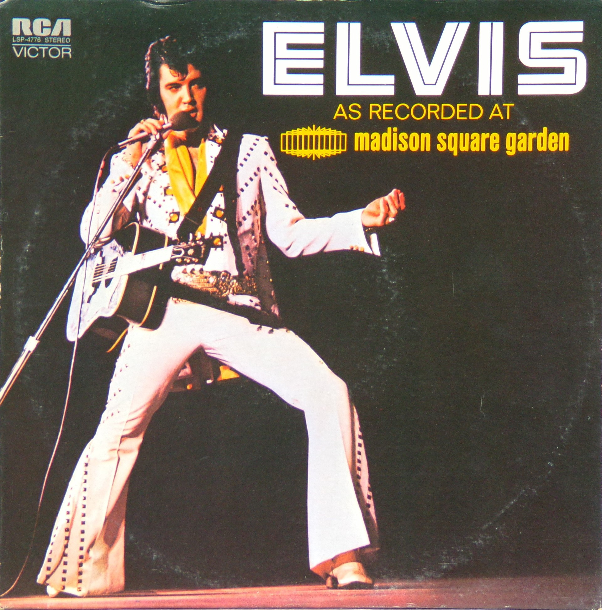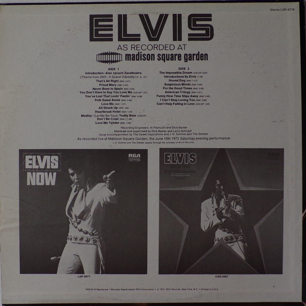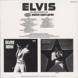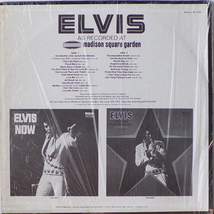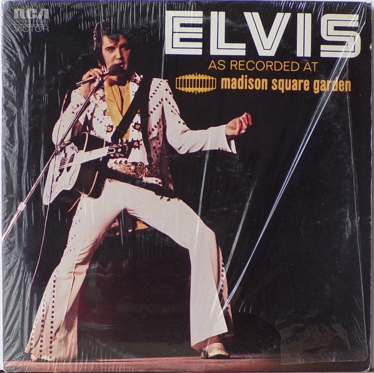 Madison Square Garden, New York City, Brief History : Elvis: As Recorded at Madison Square Garden is a live musical album recorded by Elvis Presley and released in June 1972 by RCA Records peaking on the charts in July 1972. Recorded at the Madison Square Garden arena in New York City on Saturday June 10, 1972, the concert, and the subsequent album, were promoted as being Presley's first live concerts in the Big Apple since the 1950s. It was certified Gold on 8/4/1972, Platinum on 5/20/1988, 2x Platinum on 3/27/1992 and 3x Platinum on 7/15/1999 by the RIAA. Despite the lengthy track listing, the release was only a single disc, and the record was released only a week after the concert itself. Elvis' very next album would also be a live recording featuring many of the same songs: Aloha from Hawaii: Via Satellite. The concert included on this album was the evening show. An afternoon performance was also recorded, but except for a performance of "I Can't Stop Loving You" which appeared in the 1977 compilation, Welcome to My World, it remained unreleased until the 1990s when it was issued as An Afternoon in the Garden. Drummer Ronnie Tutt claimed in an interview in 2009 for the BBC documentary Elvis in Vegas that Colonel Tom Parker sped up the mixes so that more tracks could be on the album, increasing his publishing royalties. Tutt's account has never been proven as factual. Front Cover : Photo of Elvis. Title top right. Catalogue