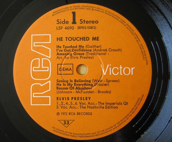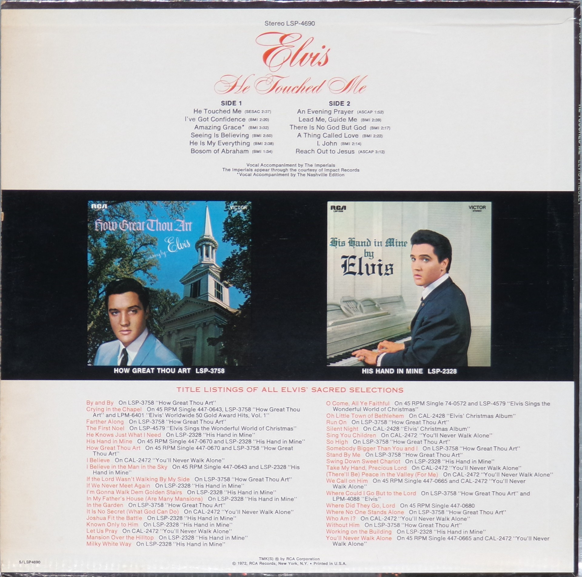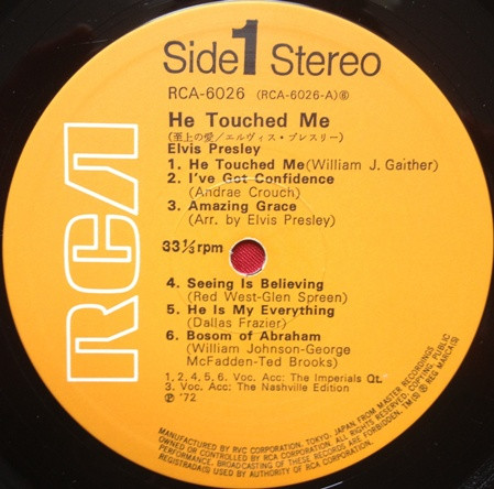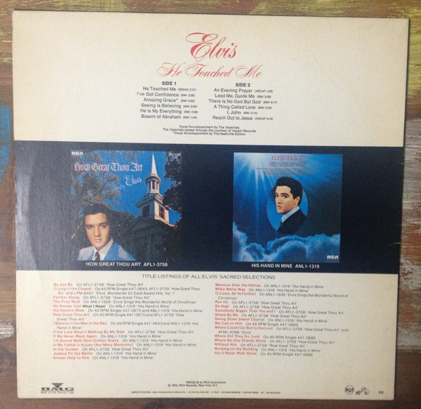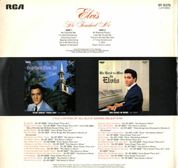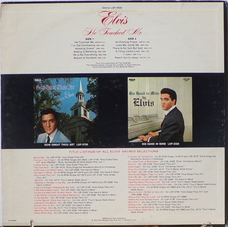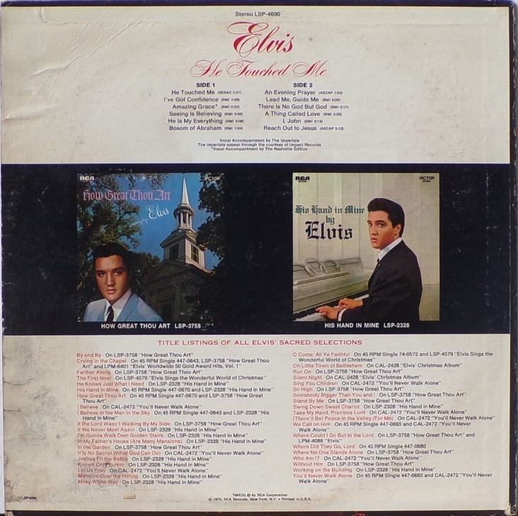 TOUCHED ME (LP) (US) RCA LSP 4690 Released: April 1972 Side 1 He Touched Me I've Got Confidence *** Amazing Grace * Seeing Is Believing **** He Is My Everything ****** Bosom Of Abraham Side 2 Evening Prayer *** Lead Me, Guide Me ** There Is No God But God ****** Thing Called Love **** I, John ****** Reach Out To Jesus ***** *