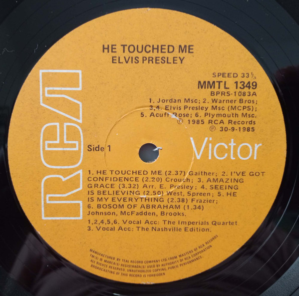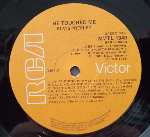 | Details : 1976 Release Front Cover : Title top centre. Catalogue number top right. Rear Cover : Advertising 2 Elvis gospel albums. Catalogue number top centre. Printed in U.S.A. bottom centre. Label : Black. D.N.T. Side A : RCA logo top. Side B : RCA logo top. Pressing Plant : Indianapolis Matrix Number Side 1 : BPRS - 1083 - 33 A2 (Machine Stamped) I - II (Hand Etched) Matrix Number Side 2 : BPRS - 1084 - 31 AC (Machine Stamped) *NOTE* Sides A & B replaces Sides 1 & 2. |