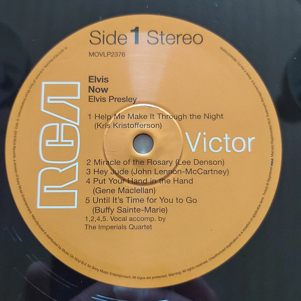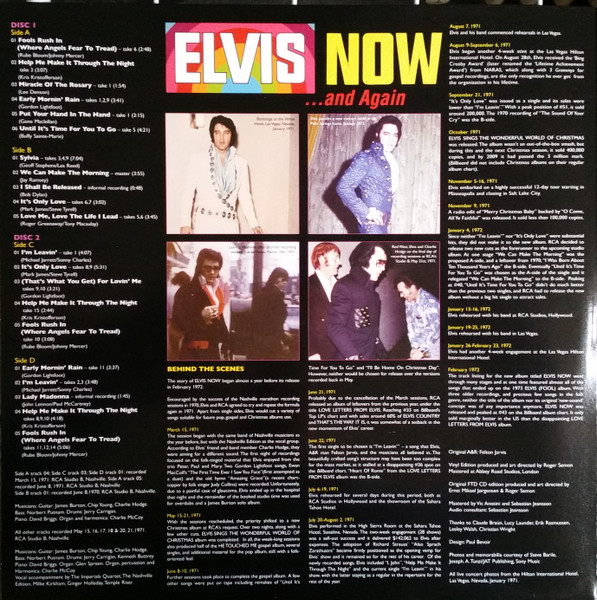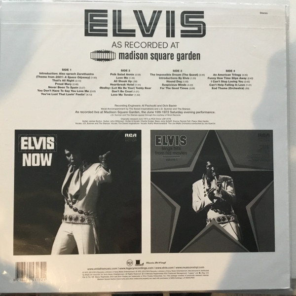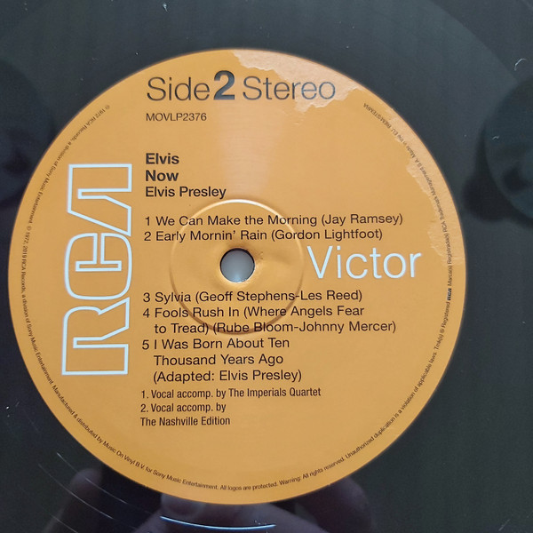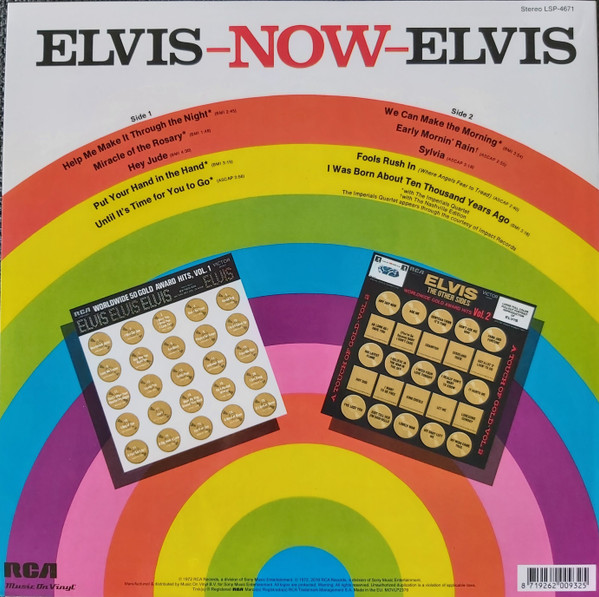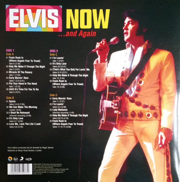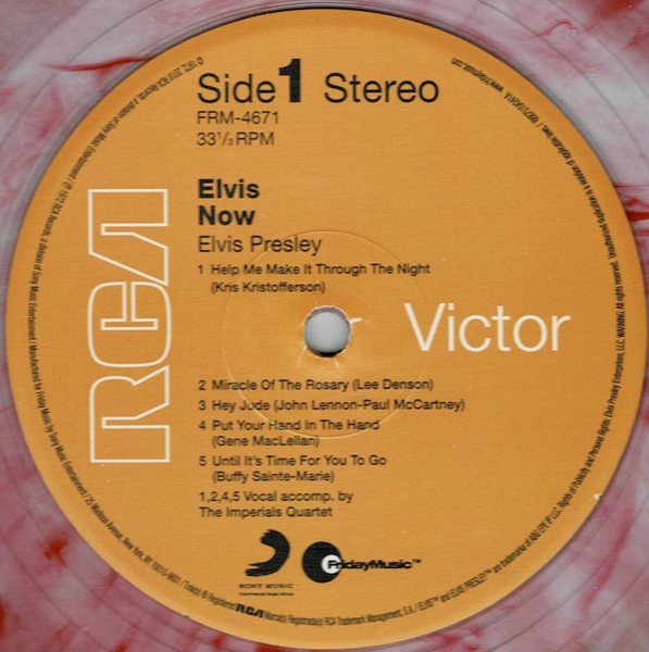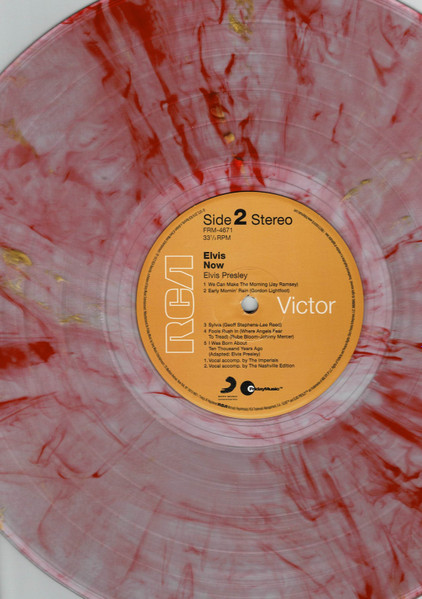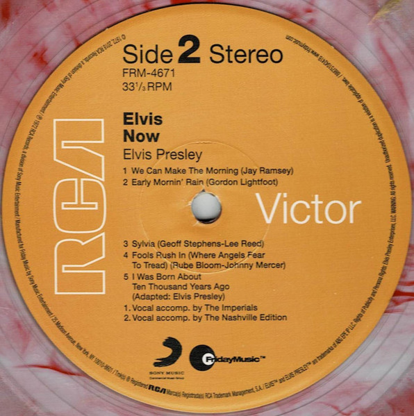 New York Mastered By – Vic Anesini Friday Music reissue, available in two formats, this copy has Red & Gold swirled vinyl. This was also released by Friday Music in a Black & Blue swirled vinyl version: Elvis Now Cat number FRM-4671 is shown on front artwork, and cat number 88875104241 appears on the rear artwork. Includes a 24x24 full color poster of album cover Barcode (Text): 8 29421 46710 6 |