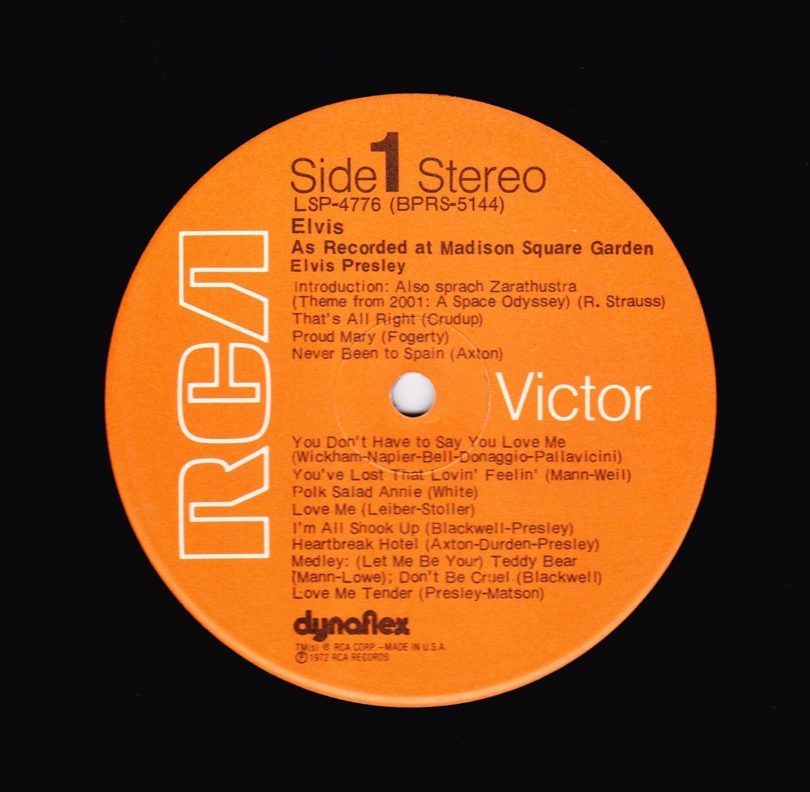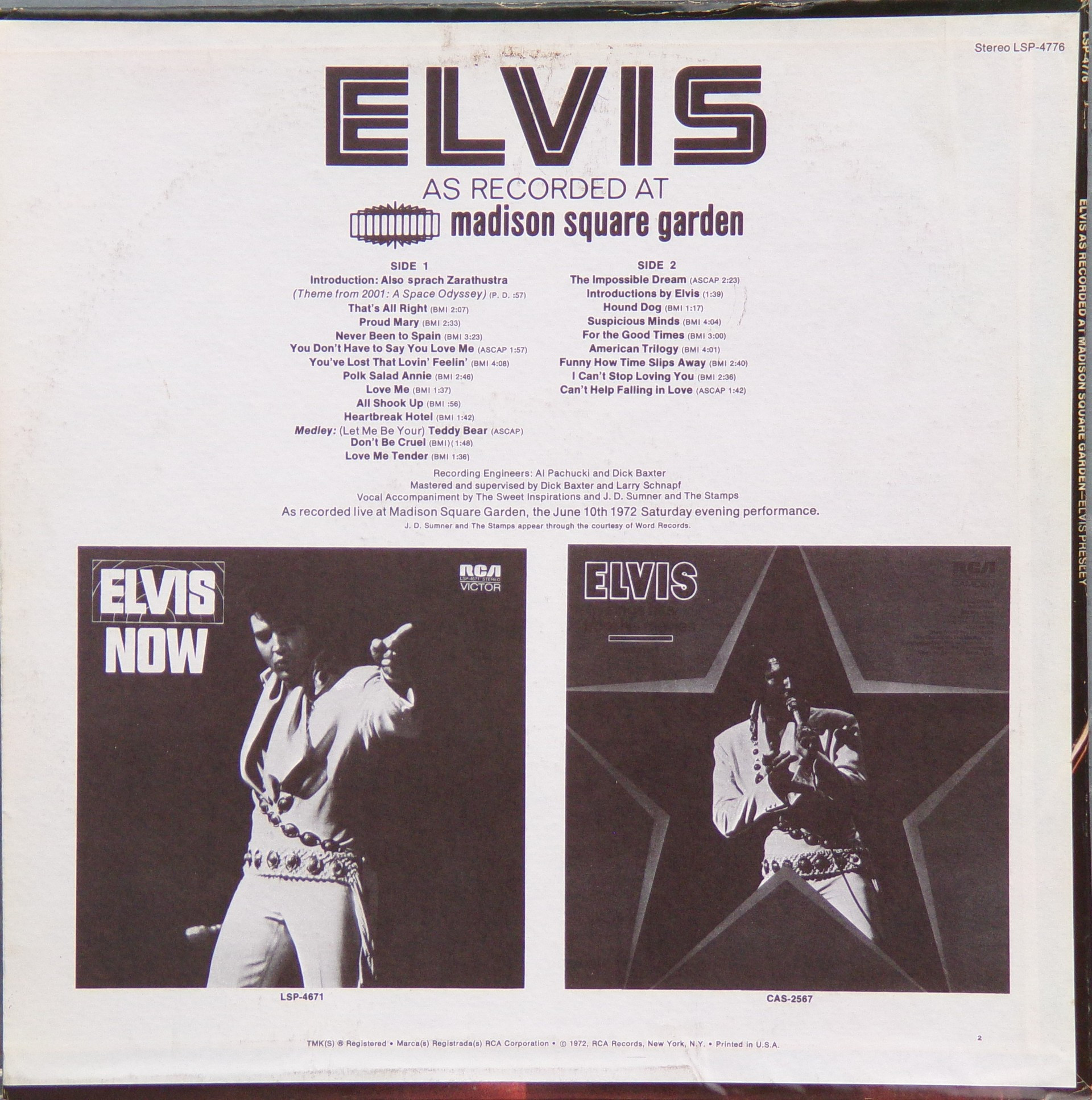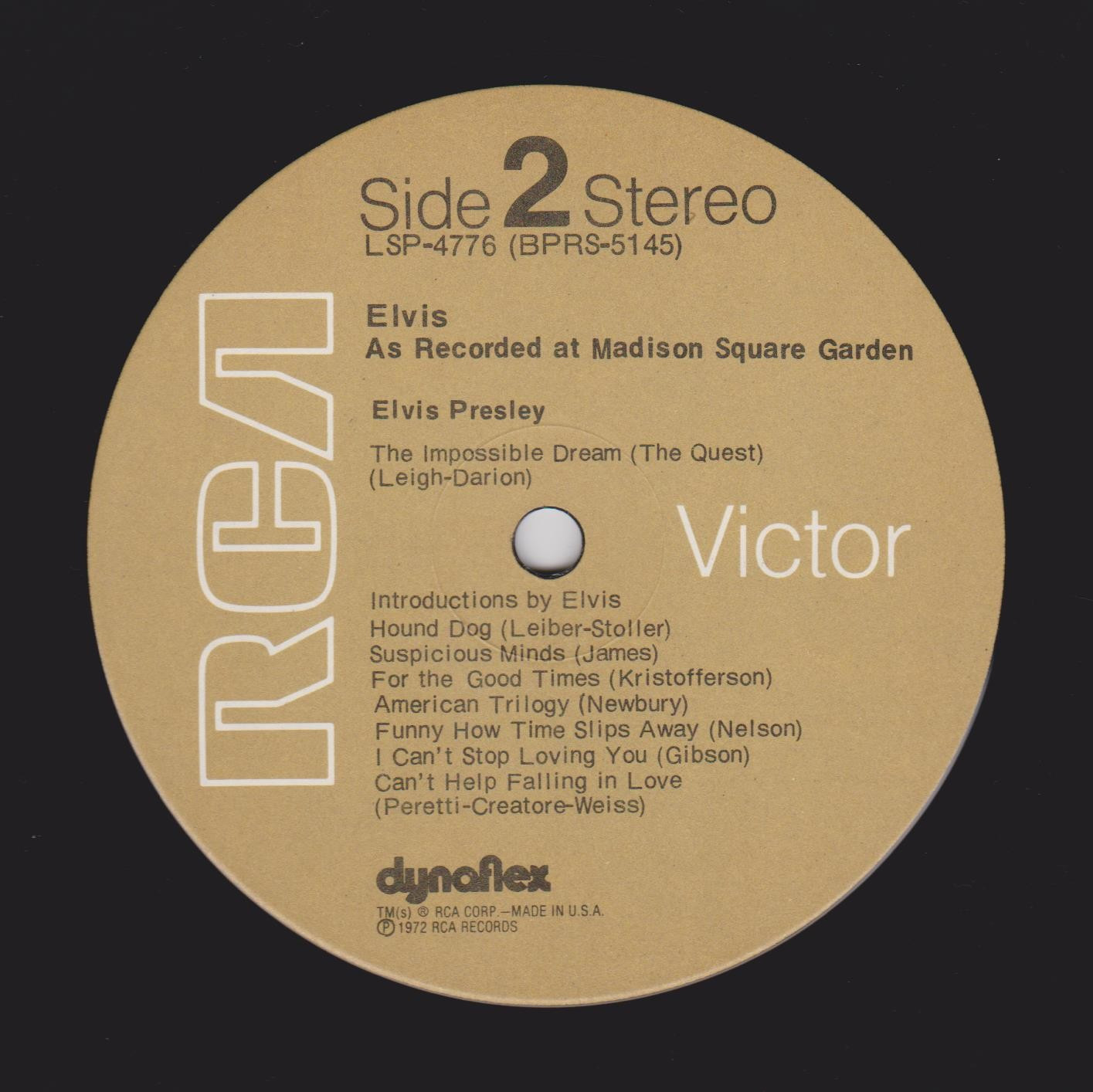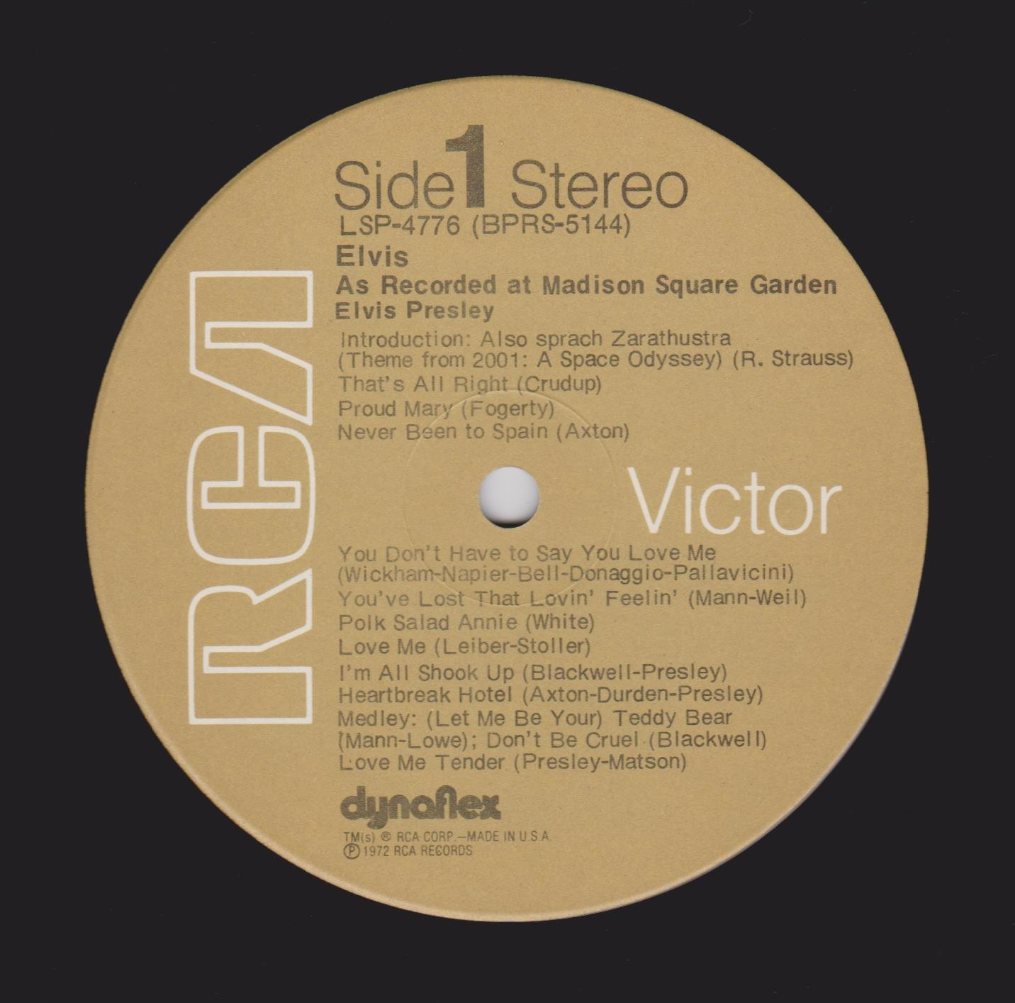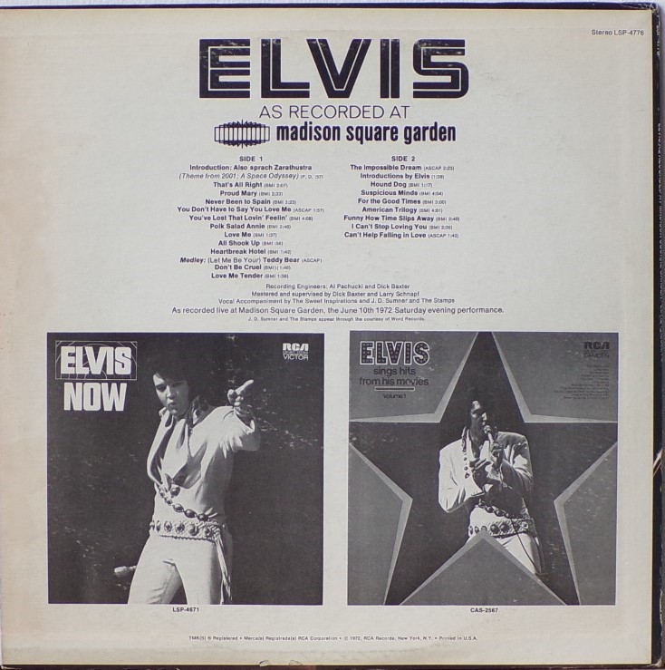 AS RECORDED AT MADISON SQUARE GARDEN (LP) (US) RCA LSP 4776 Released: June 1972 Side 1 Introduction: Also Sprach Zarathustra * That's All Right * Proud Mary * Never Been To Spain * You Don't Have To Say You Love Me * You've Lost That Lovin' Feelin' * Polk Salad Annie * Love Me * All Shook Up * Heartbreak Hotel * Teddy Bear / Don't Be Cruel * Love Me Tender * Side 2 Impossible Dream * Introduction By Elvis * Hound Dog * Suspicious Minds * For The Good Times * American Trilogy * Funny How Time Slips Away * I Can't Stop Loving You * Can't Help Falling In Love * End Theme * * Recorded: