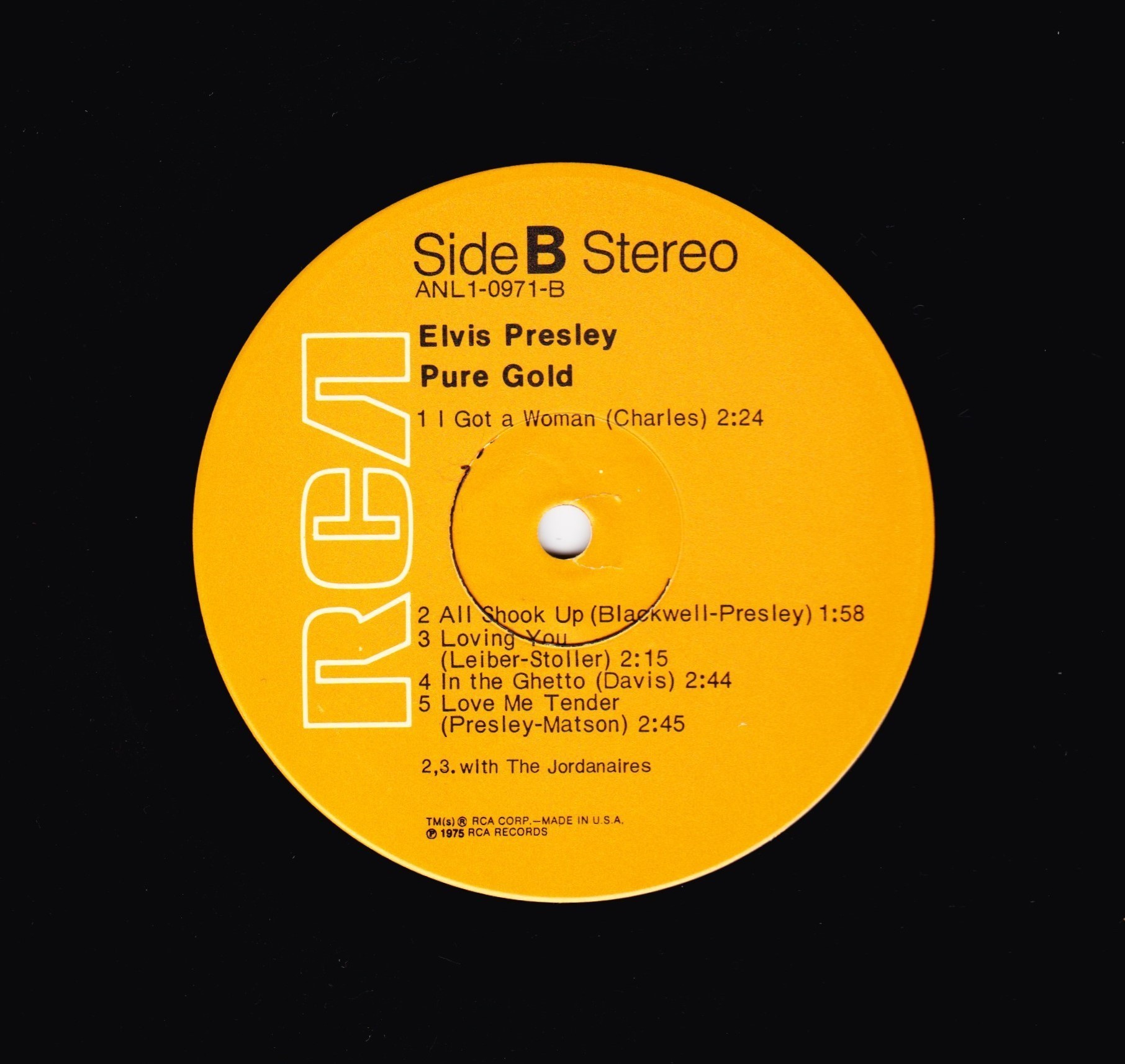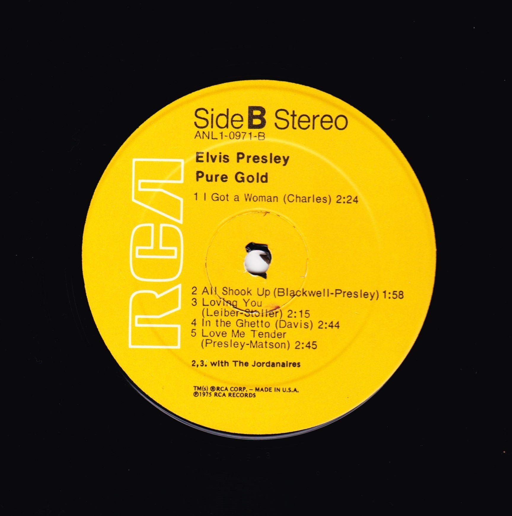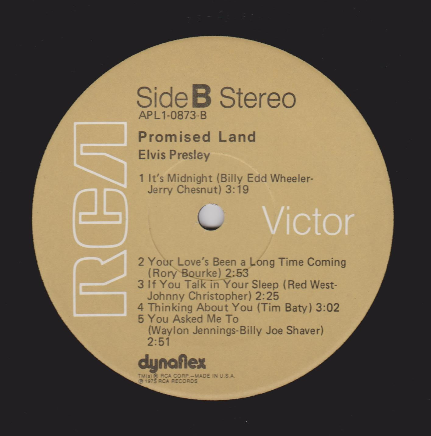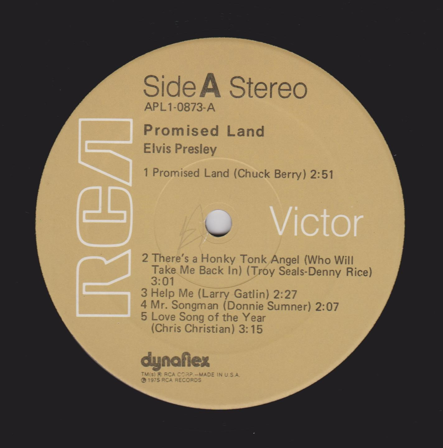 top right & bottom left. Rear Cover : Advert for 4 Elvis albums. Catalogue number top centre. Printed in U.S.A. bottom. Label : Tan. Dynaflex vinyl. Side A : Stereo at top. Side B : Stereo at top. Pressing Plant : Indianapolis Matrix Number Side A : APL1 - 0873 A - 1S (Machine Stamped) Matrix Number Side B : APL1 - 0873 B - 1S (Machine Stamped) *NOTE* Flat label. |