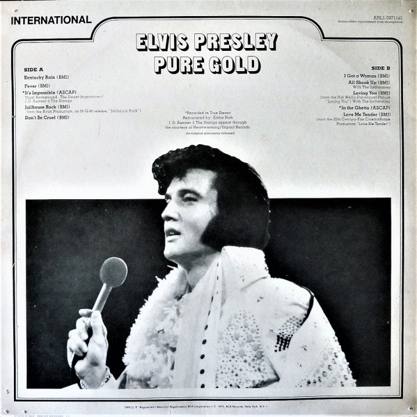 GOLD (LP) Brief History : Pure Gold is a 1975 compilation album by Elvis Presley released as part of RCA's budget "Pure Gold" series of albums. Though at this point in his career Presley was focused more on the country music market, where he had a string of chart-topping records in recent years, this compilation focuses more on earlier material than recent hits. "Kentucky Rain", "Fever", "It's Impossible", and "In The Ghetto" are true stereo mixes. All other tracks are in "electronically reprocessed" stereo. When this album was eventually issued on CD in the early 1990s, the 6 songs from the 50's were restored to original monaural sound. It was certified Gold on 9/12/1977, Platinum on 3/20/1988 and 2x Platinum on 3/27/1992 by the RIAA. The front cover photo features Elvis from his Aloha from Hawaii concert in 1973. Front Cover : Photo of Elvis. Title top right. Catalogue
