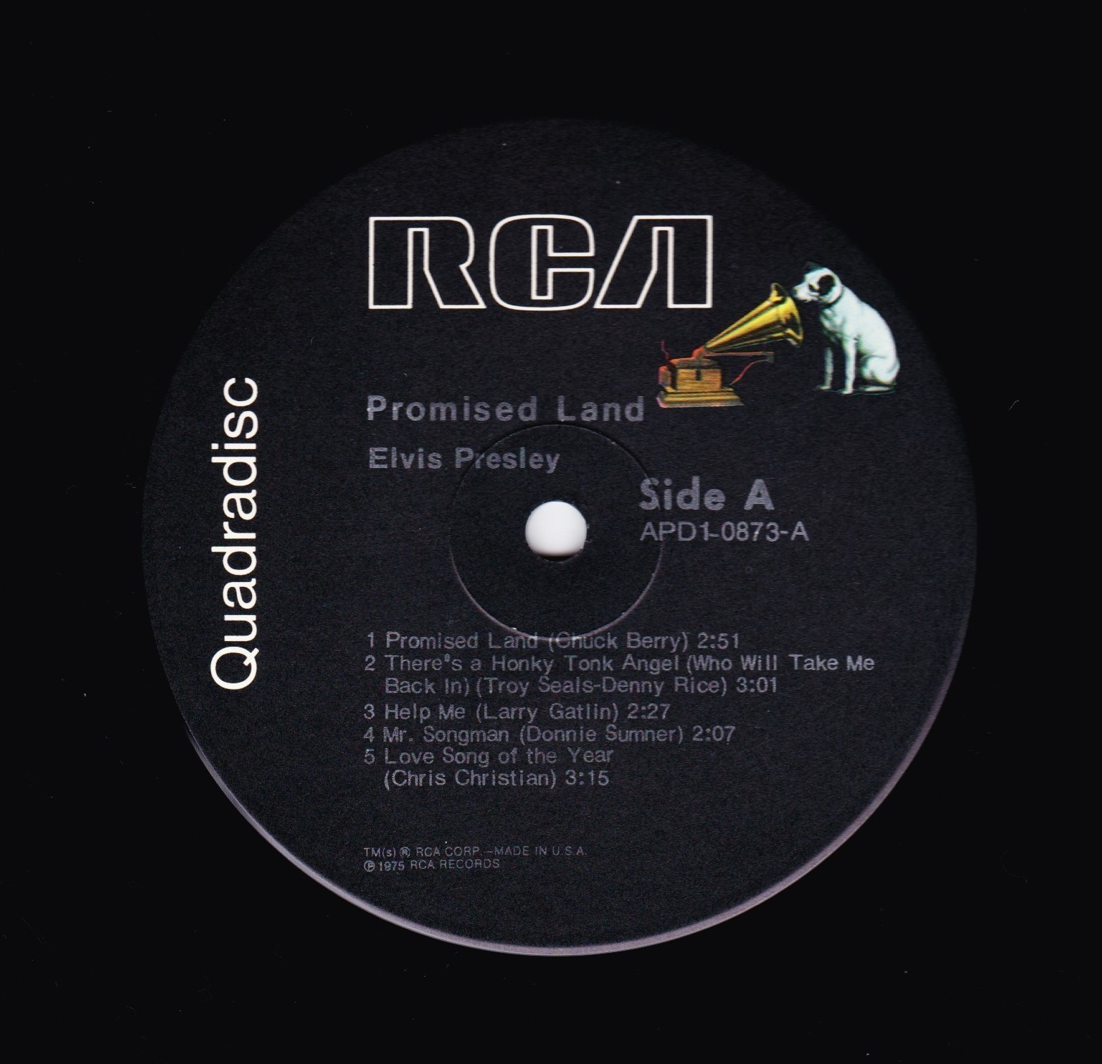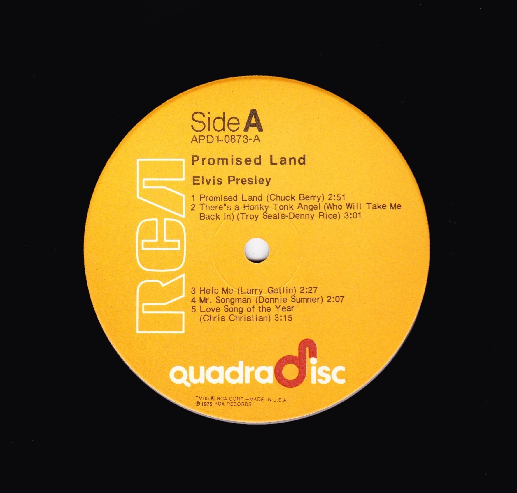 Catalogue Number : APD1 - 0873 Brief History : CD-4 (Compatible Discrete 4) / Quadradisc Compatible Discrete 4 (CD-4) or Quadradisc (not to be confused with compact disc) was introduced in May 1972 as a discrete quadraphonic system created by JVC and RCA. Record companies who adopted this format include Arista, Atlantic, Capricorn, Elektra, Fantasy, JVC, Nonesuch, A & M, Reprise and Warner. This was the only fully discrete quadraphonic phonograph record system to gain major industry acceptance. n the CD-4 system, the quadraphonic audio was divided into left and right channels, which were recorded orthogonally in the vertical plane of the disc groove, which is the case with normal stereo. The audio frequencies (20 Hz to 15 kHz), often referred to as the sum channel, would contain the sum of the left front plus left back signals in the left channel and the sum of the right front plus the right back signals in the right channel. In other words, when observing the audio frequencies only, the record appeared to have an ordinary stereo recording. Along with this audio, a separate 30 kHz carrier was recorded on each groove wall. The carrier on each side carried the difference signal for that side. This was the information that enabled a combined signal to be resolved into two separate signals. For the left carrier it would be left front minus left back, and for the right carrier it would be the right front minus the right back. These audio signals were modulated onto the carriers using a special FM-PM-SSBFM (frequency modulation-phase modulation-single sideband frequency modulation) technique. This created an extended carrier frequency range from 18 kHz to 45 kHz for the left and right channels. The algebraic addition and subtraction of the sum and difference signals would then yield compatible and discrete quadraphonic playback. CD-4 was responsible for major improvements in phonograph technology including better compliance, lower distortion levels, pick-up cartridges with a significantly higher frequency range, and new record compounds such as Q-540, which were highly anti-static. A typical CD-4 system would have a turntable with a CD-4 cartridge, a CD-4 demodulator, a discrete four-channel amplifier, and (ideally) four full-range loudspeakers. Some manufactures built the CD-4 demodulator into complete four-channel receivers. Simply put, CD-4 consists of four recorded signals (LF, LB, RB, RF) and the following coding matrix, similar to FM broadcast stereo multiplexing. The CD-4 encoding/decoding matrix: There was also a similar FM radio system called Quadracast. But CD-4 (and quadraphonic audio in general) failed due to late FCC approval of FM quadraphonic broadcasting, the improvements CD-4 engendered spilled over into, and substantially improved, the production of conventional stereo LP records. The CD-4 record track is broader than a conventional stereo track, so maximum the playing time is lower than a conventional stereo record. Quadradiscs/CD-4 records were seldom called quadraphonic. When a record was called quadraphonic it was almost always an SQ-encoded or an other matrixed record. But when a record was called quadradisc it was always a CD-4 record. Front Cover : Photo of Elvis. Title top left under Quadradisc.