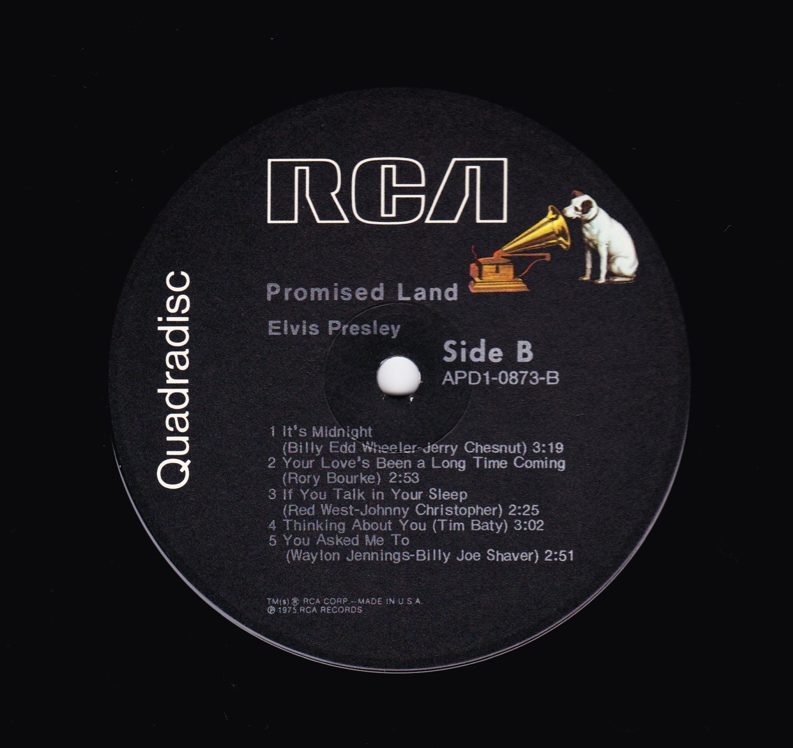 | Details : 1977 Reissue Front Cover : Photo of Elvis. Title top left under Quadradisc. Catalogue number top right & bottom left. Rear Cover : Advert for 4 Elvis albums. Catalogue number top centre. Printed in U.S.A. bottom. Label : Black. Quadradisc vinyl. Dog near top. Side A : RCA logo at top. Side B : RCA logo at top. Pressing Plant : Indianapolis Matrix Number Side A : ADL1 - 0873 A - 2 Q A1 (Machine Stamped) E (Hand Etched) Matrix Number Side B : APL1 - 0873 B - 1 Q A1 (Machine Stamped) D (Hand Etched) *NOTE* Quadradisc now on side of vinyl label. |