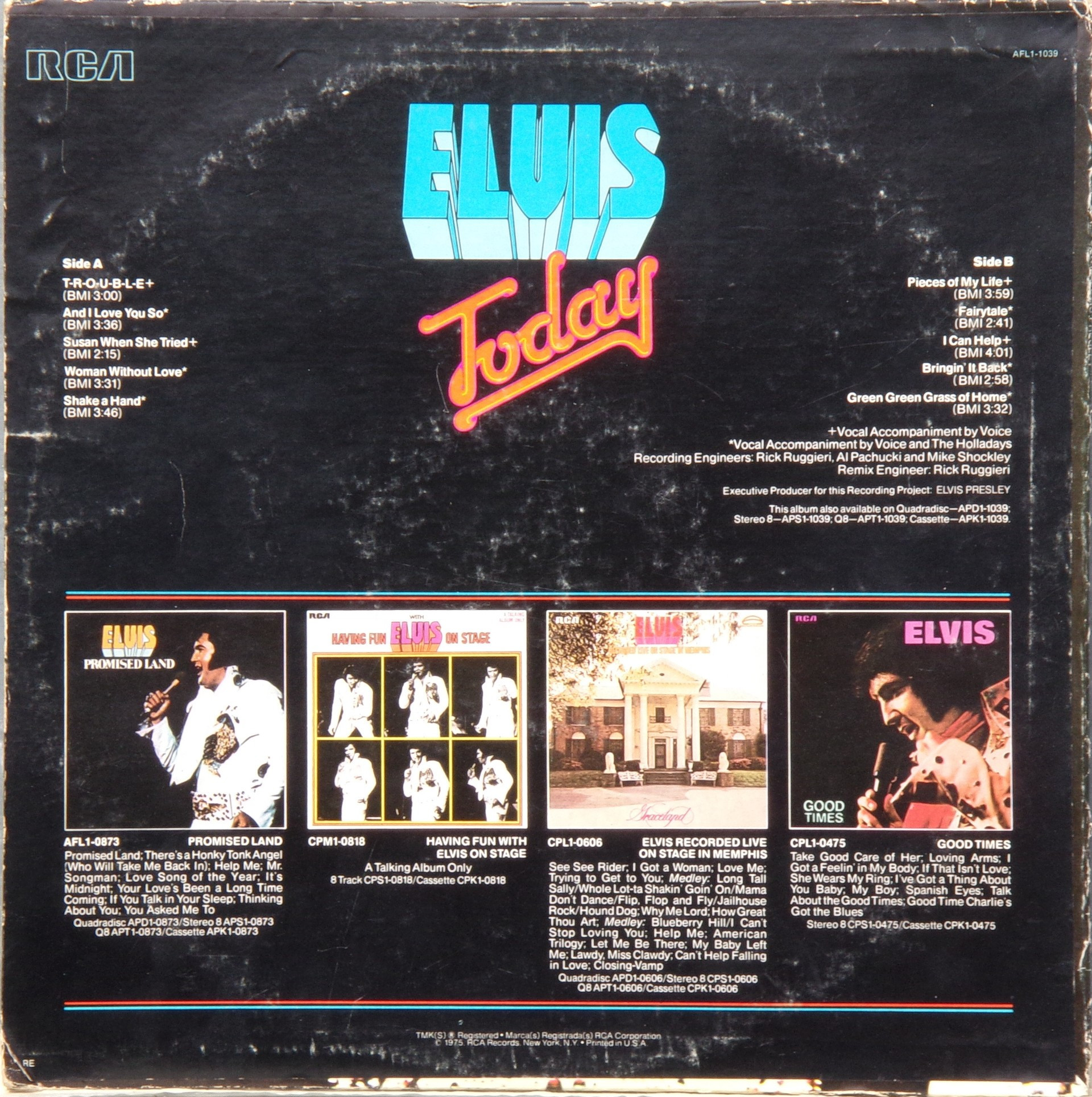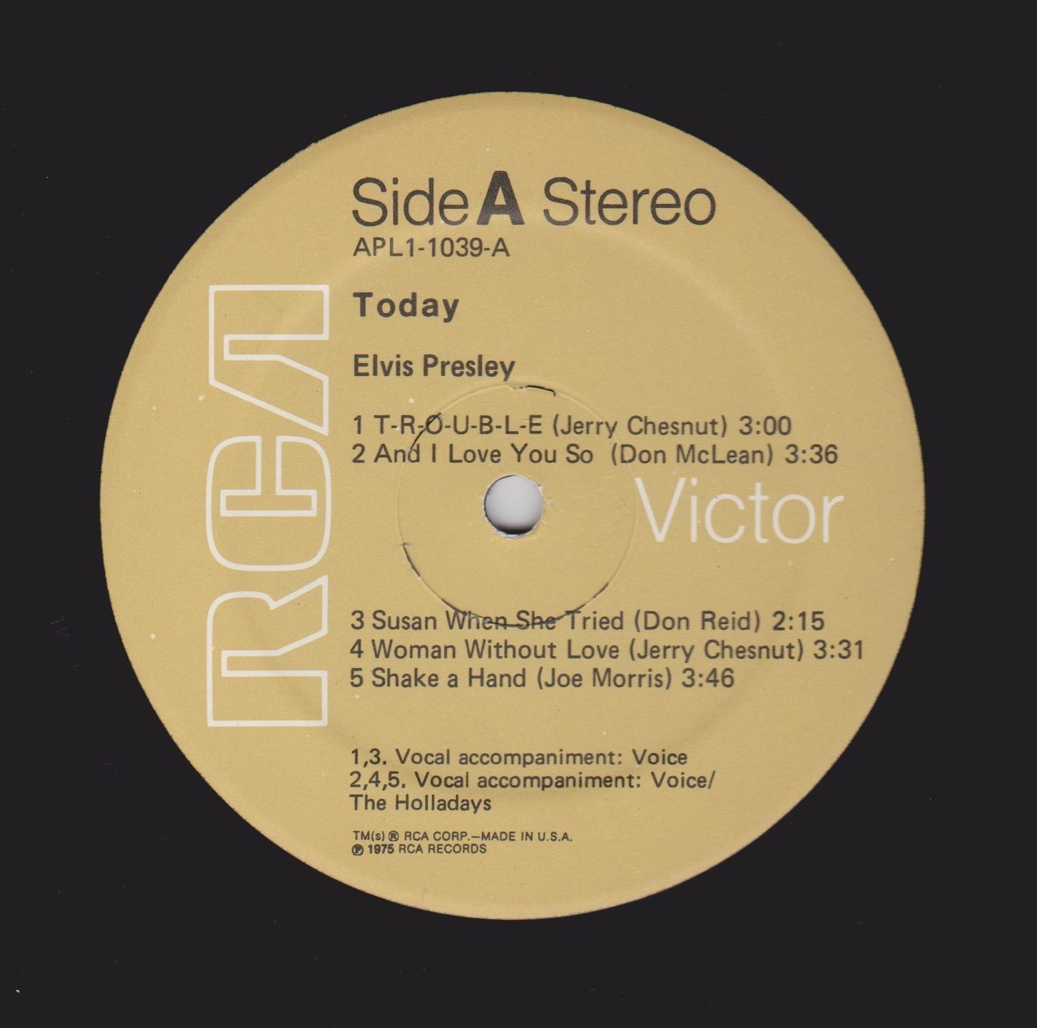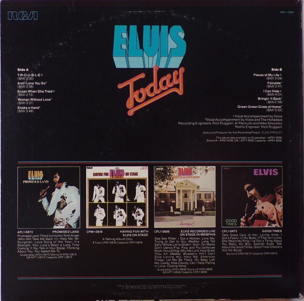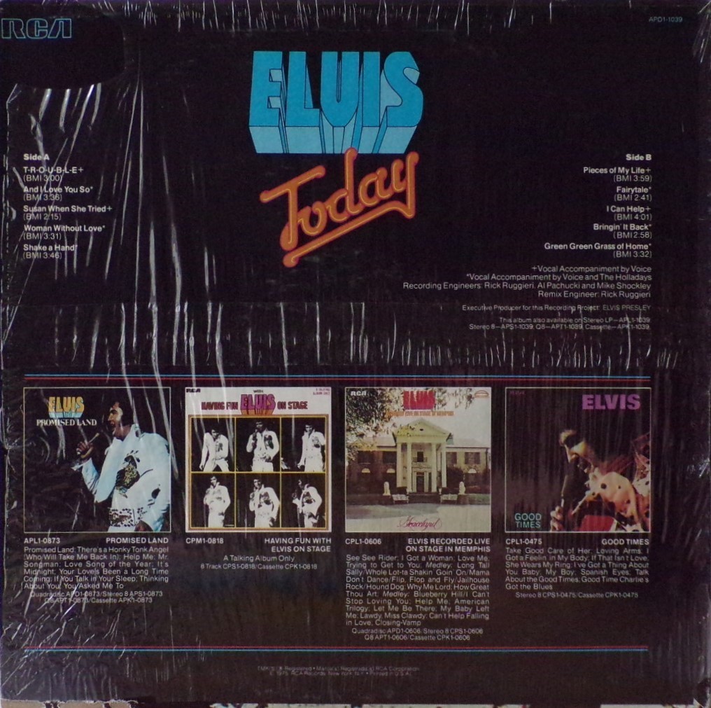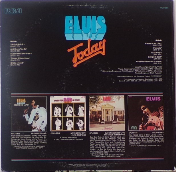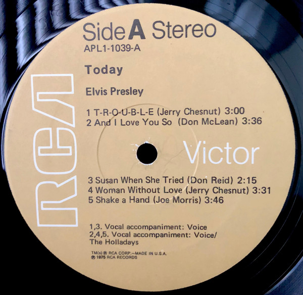 TODAY (LP) (US) RCA APL1 1039 Label: RCA Victor – APL1-1039 Format: Vinyl, LP, Album Country: US Released: 1975 Side 1 T-R-O-U-B-L-E And I Love You So ** Susan When She Tried ** Woman Without Love *** Shake A Hand *** Side 2 Pieces Of My Life **** Fairytale * I Can Help ** Bringin' It Back *** Green, Green Grass Of Home ** *