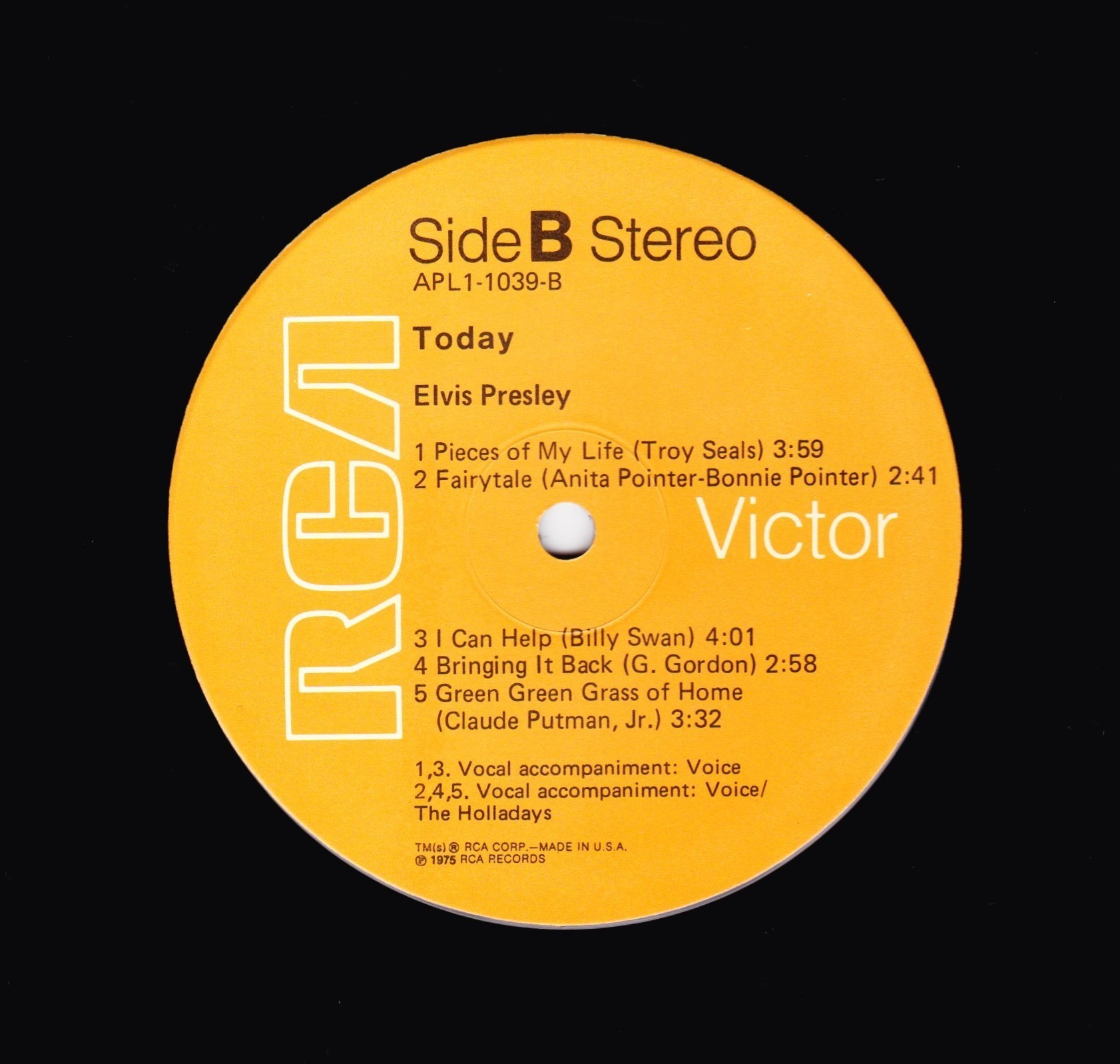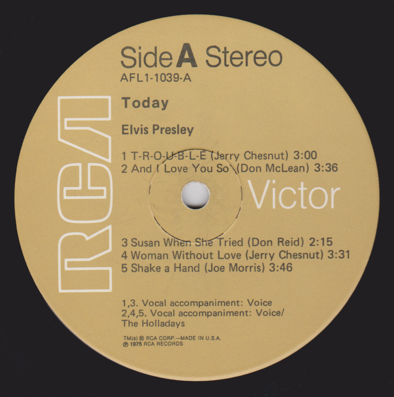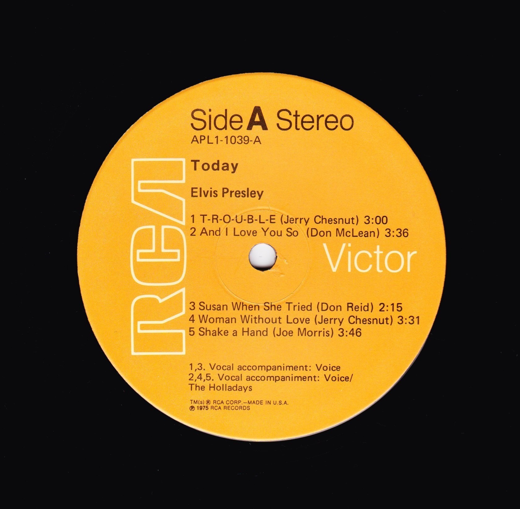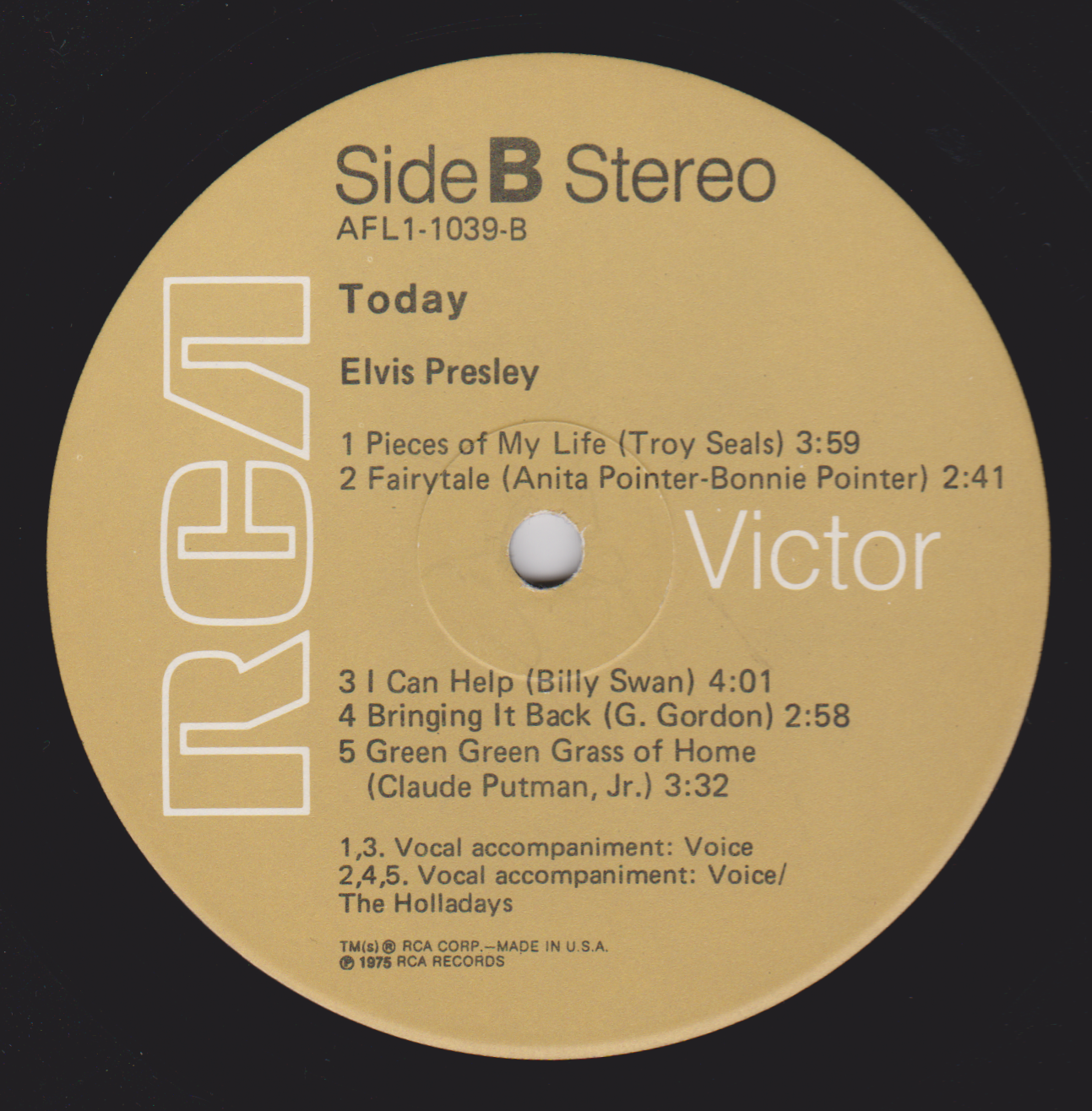 TODAY (LP) (US) RCA APL1 1039 Label: RCA Victor – APL1-1039 Format: Vinyl, LP, Album Country: US Released: 1975 Side 1 T-R-O-U-B-L-E And I Love You So ** Susan When She Tried ** Woman Without Love *** Shake A Hand *** Side 2 Pieces Of My Life **** Fairytale * I Can Help ** Bringin' It Back *** Green, Green Grass Of Home ** *