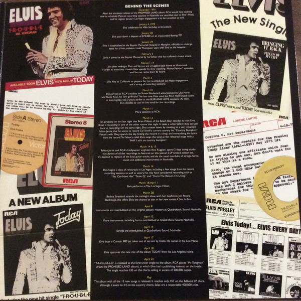 Recorded: RCA Studio C, Hollywood, March 10, 1975 Brief History : The Today sessions were held in RCA's Studio C, Hollywood, Los Angeles, California, March 10–12, 1975, and marked the last time Elvis Presley would ever record in a studio. Elvis last recorded at Studio C, Hollywood in 1972 where he recorded the gold records "Burning Love" and "Separate Ways". At this time, Elvis was 40 years old. He was accompanied by his then-current girlfriend, Sheila Ryan. In the 2005 FTD TODAY release from these sessions, Elvis asked her to "step up here Sheila, let me sing to ya baby" on Take 1 of Don McLean's "And I Love You So". He continued to make "And I Love You So" and "Fairytale" a part of his live concerts until his death. On stage, he often referred to "Fairytale" as the story of his life. Today featured a new rock song, "T-R-O-U-B-L-E", which was released as its first single and went Top 40 in the US. "Bringin' It Back" was its second single in the US. The album also features covers of songs by Perry Como, Tom Jones, The Pointer Sisters, Billy Swan, Faye Adams, The Statler Brothers and Charlie Rich. "Green Green Grass of Home" was released as a single in the UK, where it went Top 30, and also received US airplay. Elvis first heard the song in 1967. Eight years later Elvis cut his own classic version of the Vietnam era "Green Green Grass of Home". |