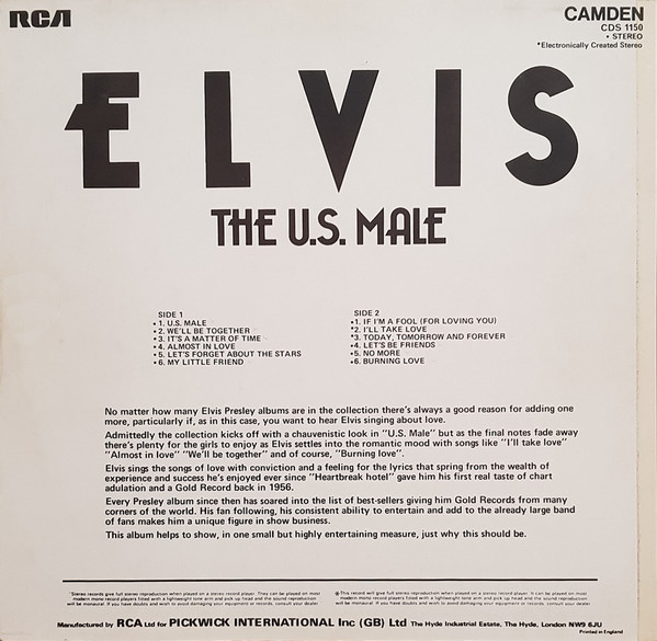 | Details : 1976 Reissue Front Cover : Photo of Elvis. Title top right. Catalogue number bottom right. Rear Cover : Advert for 4 Elvis albums. Catalogue number top right. Printed in U.S.A. bottom. Label : Tan. Flexible vinyl. Side A : Stereo at top. Side B : Stereo at top. Pressing Plant : Los Angeles Matrix Number Side A : APL1 - 1039 A - 31S T (Hand Etched) TML-S (Machine Stamped) Matrix Number Side B : APL1 - 1039 B - 30S T (Hand Etched) TML-M A1 (Machine Stamped) *NOTE* Ribbed label. |