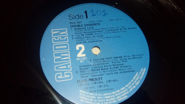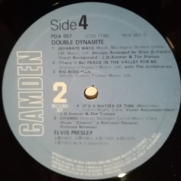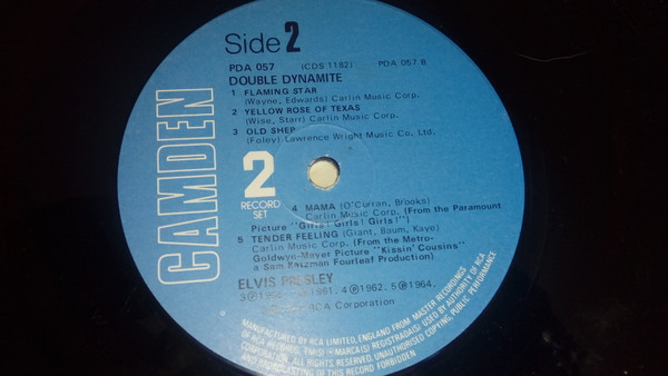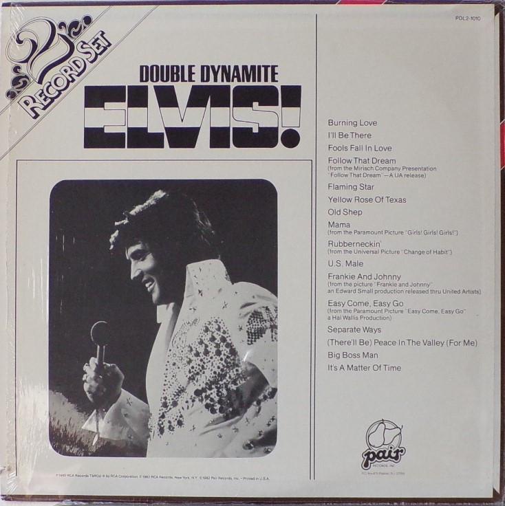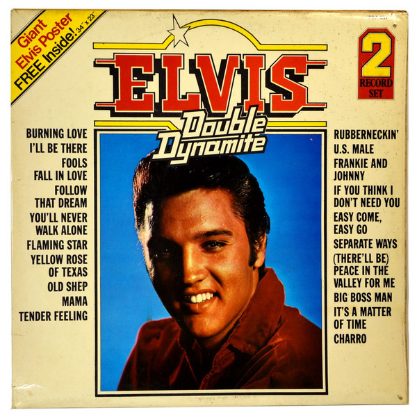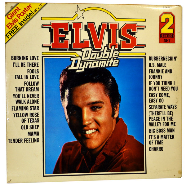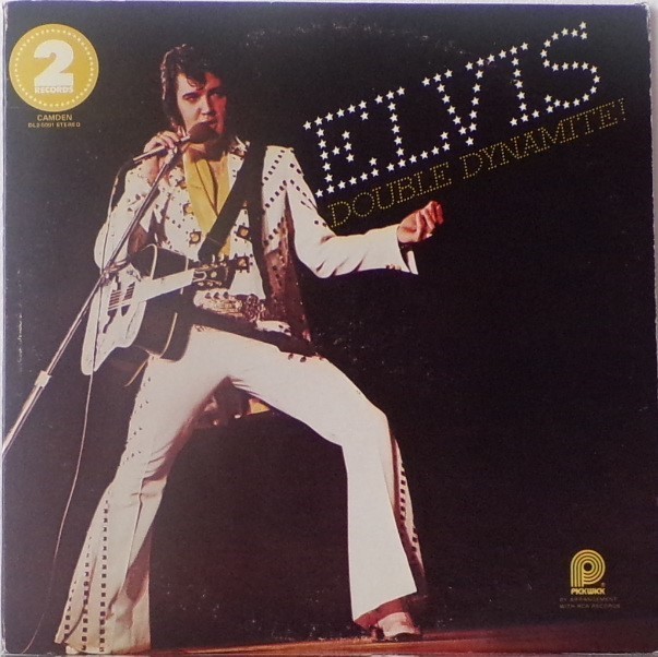 DYNAMITE (LP) Brief History : Double Dynamite is a compilation album by Elvis Presley. The album was released in December, 1975, and compiles various tracks that had previously been released on 9 budget-priced albums on the RCA Camden label. It was certified Gold and Platinum on 1/6/2004 by the RIAA. Front Cover : Photo of Elvis. Title top right. Catalogue