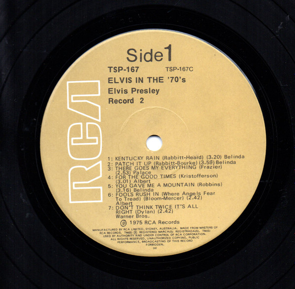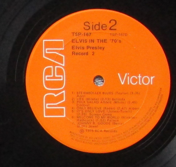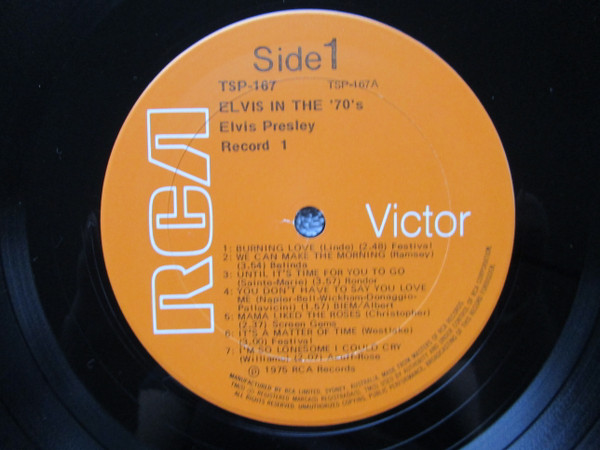 | Elvis In The 70's Label: RCA Victor – TSP-167 Australian compiled and manufactured double album. "Made in Australia" on spine, A1075N release date code on lower RH rear cover corner Matrix / Runout ( record 1, side 1 label ): TSP-167A |