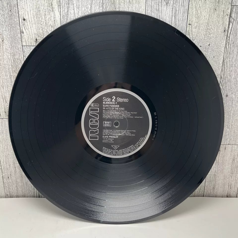 RCA – NL 89 830 (6) 01: My Baby Left Me 02: Heartbreak Hotel 03: Blue Suede Shoes 04: Hound Dog 05: Love Me Tender 06: Got A Lot O' Livin' To Do! 07: (Let Me Be Your) Teddy Bear 08: I'm All Shook Up Side 2: 01: Don't 02: Hard Headed Woman 03: King Creole 04: Jailhouse Rock 05: A Big Hunk O' Love 06: I Got Stung 07: One Night 08: Stuck On You Side 3: 01: Fever 02: It's Now Or Never 03: Are You Lonesome Tonight? 04: Wooden Heart 05: Surrender 06: Wild In The Country 07: Rock-A-Hula Baby 08: Can't Help Falling In Love Side 4: 01: Good Luck Charm 02: Return To Sender 03: You're The Devil In Disguise 04: Crying In The Chapel 05: Guitar Man 06: In The Ghetto 07: Suspicious Minds 08: There Goes My Everything Side 5: 01: Don't Be Cruel (To A Heart That's True) 02: I Want You, I Need You, I Love You 03: Too Much 04: Loving You 05: Treat Me Nice 06: I Beg Of You 07: Ain't That Loving You Baby 08: Wear My Ring Around Your Neck Side 6: 01: Such A Night 02: A Mess Of Blues 03: I Gotta Know 04: Kiss Me Quick 05: Little Sister 06: No More (La Paloma) 07: I Feel So Bad 08: King Of The Whole Wide World 09: (Such An) Easy Question Side 7: 01: Bossa Nova Baby 02: Mexico 03: Witchcraft 04: What'd I Say 05: Kissin' Cousins 06: Viva Las Vegas 07: Ask Me 08: It Hurts Me Side 8: 01: I've Lost You 02: I Just Can't Help Believin' 03: Love Letters 04: You Don't Have To Say You Love Me 05: The Wonder Of You 06: Burning Love 07: My Way Side 9: 01: Blue Moon 02: Money Honey 03: I Got A Woman 04: Tutti Frutti 05: Long Tall Sally 06: Blueberry Hill 07: Mean Woman Blues 08: Your Cheatin' Heart Side 10: 01: Dixieland Rock 02: (Now And Then There's) A Fool Such As I 03: Lover Doll 04: Doncha' Think It's Time 05: Make Me Know It 06: Fame And Fortune 07: The Girl Of My Best Friend 08: Lonely Man Side 11: 01: Blue Hawaii 02: (Marie's The Name) His Latest Flame 03: Aloha - Oe 04: Anything That's Part Of You 05: Night Rider 06: Suspicion 07: She's Not You 08: Santa Lucia Side 12: 01: (It's A) Long Lonely Highway 02: Please Don't Drag That String Around 03: Memphis, Tennessee 04: Little Egypt 05: Do The Clam 06: Indescribably Blue 07: Gentle On My Mind 08: Any Day Now Distributed By – RCA, Ariola Phonographic Copyright ℗ – RCA Schallplatten GmbH Copyright © – RCA Schallplatten GmbH Comes with a plastic "3D-Poster".Rights Society: BIEM and GEMA Label Code: LC 0316Elvis Forever 96 Hits Of The King NL 89 830 (6) |