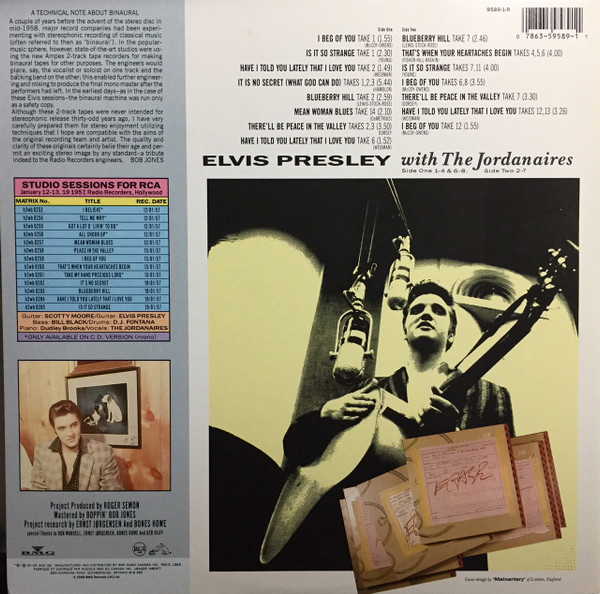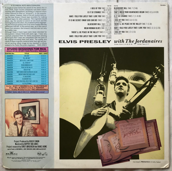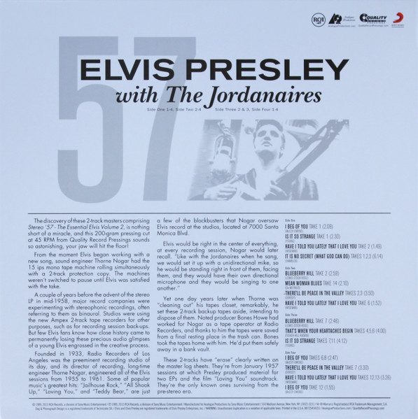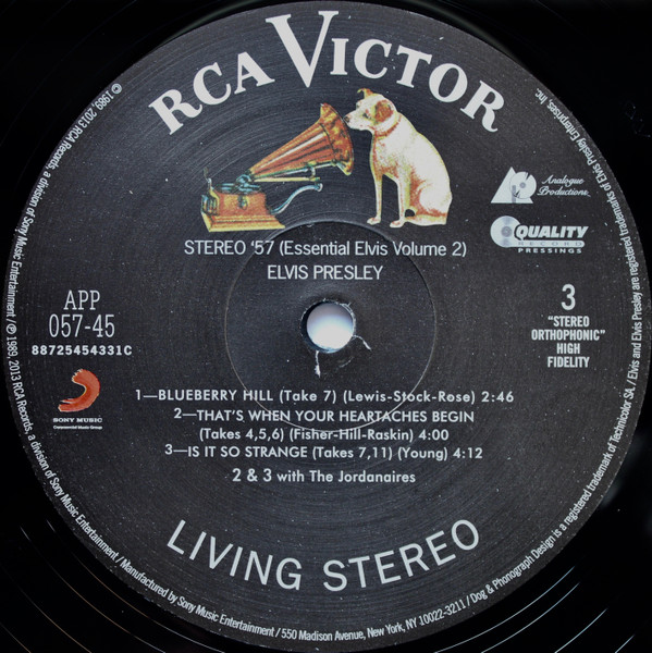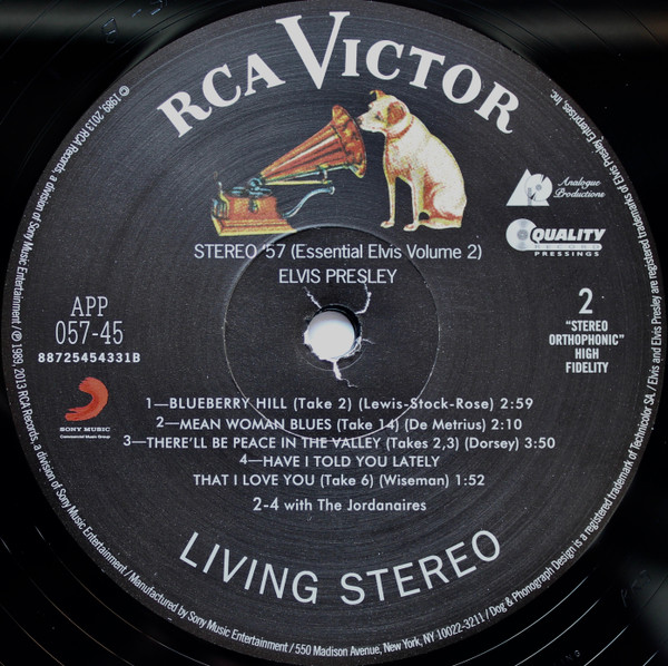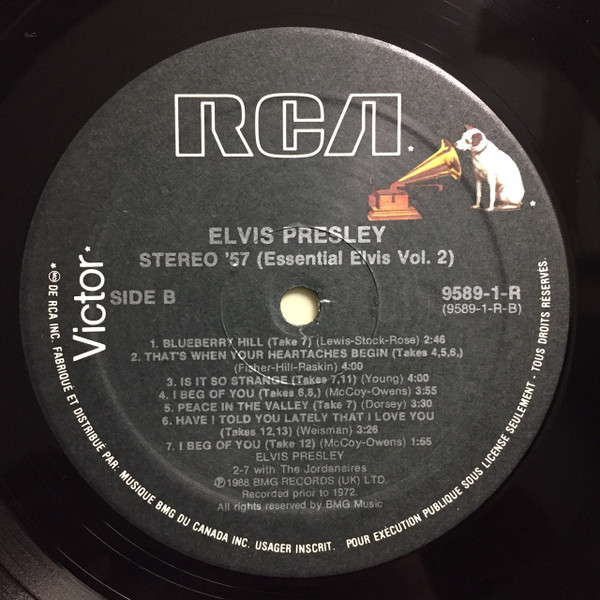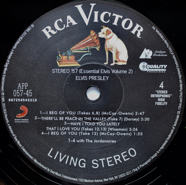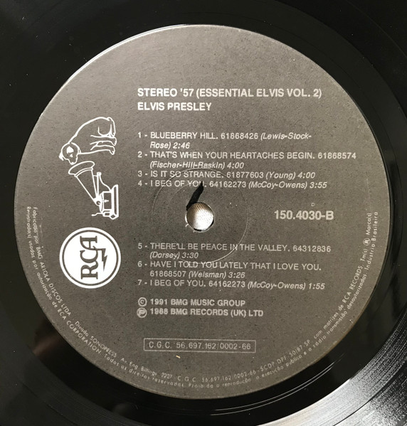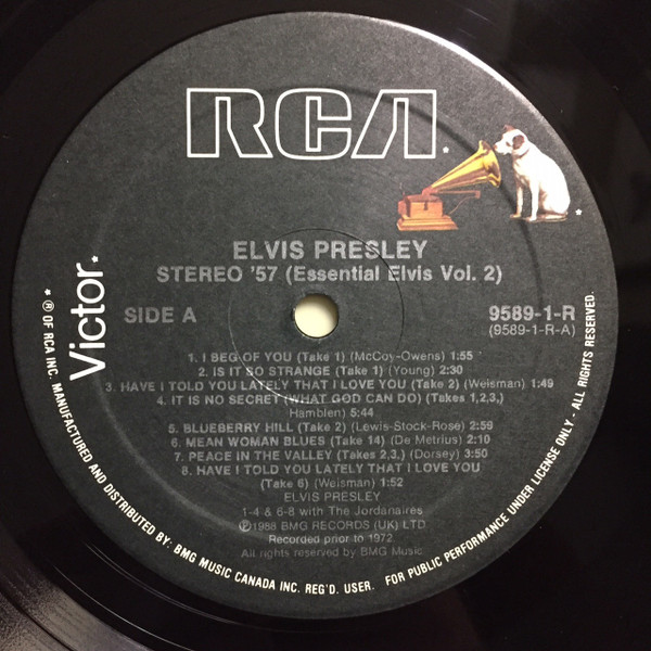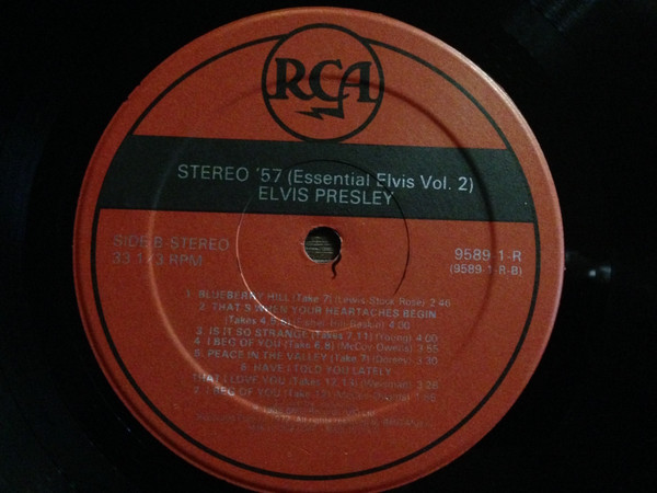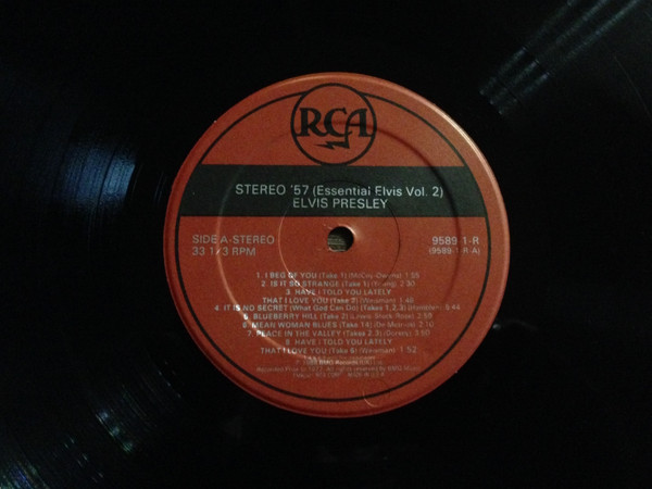 ELVIS VOLUME 2 - STEREO '57 Side One Side Two Brief History : Top Disc: Red, black and silver label. Matrix numbers Sticker: Yellow with red text. Reads Rare Unreleased. Historic Presley Recordings. Elvis Collectibles Complete With Studio Dialog & Extra Takes. 9589-1-R. Inner Sleeves |