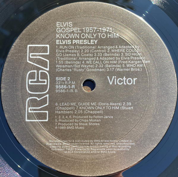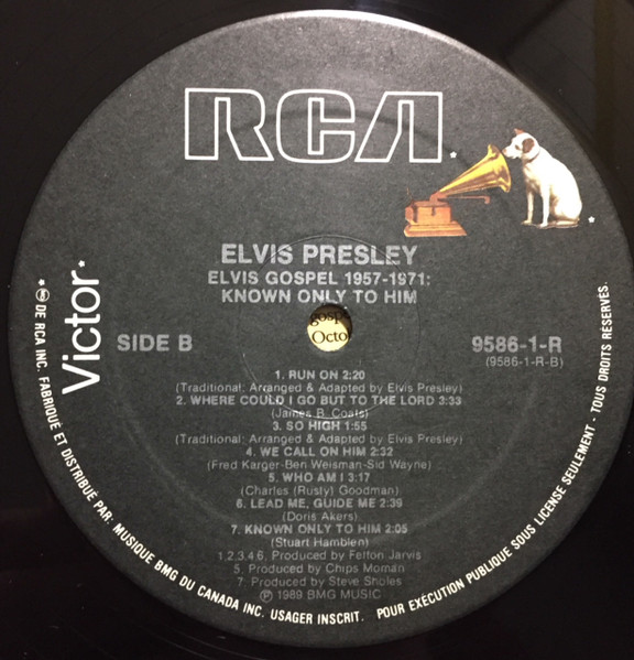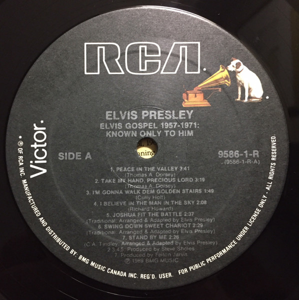 Label: RCA Victor – 9586-1-R Manufactured By – BMG Music Canada INC. – 9586-1-R Title on cover is Elvis Gospel 1957 - 1971 Known Only to Him, title on label includes a colon: Elvis Gospel 1957 - 1971: Known Only to Him. Matrix / Runout (Side A): 9586-1-R A2 |