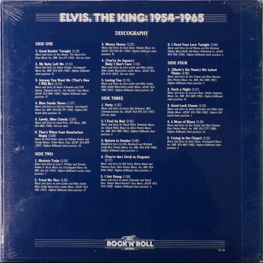 Album Title : Elvis Presley 1954 - 1965 Catalogue Number : STL - 126 Year Release : February 1989 Side One: Side Two: Side Three: Side Four: Brief History: 1989 USA Time Life 'The Rock 'N' Roll Era' mail order only 22-track digitally remastered double vinyl LP box set. Presented in a superb unique picture box STL-126. Details : 1989 Release |
